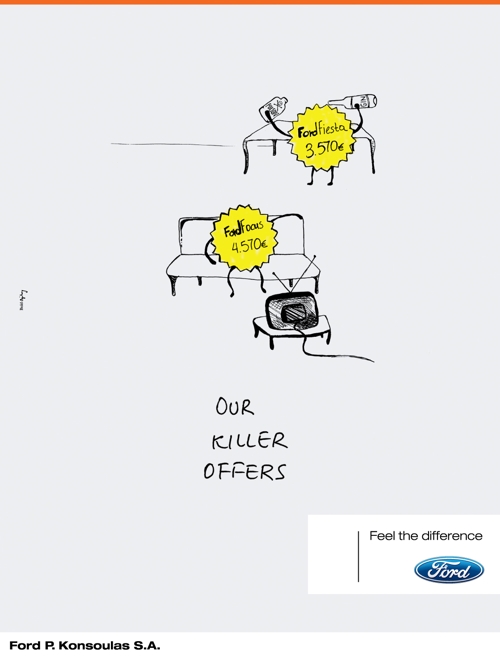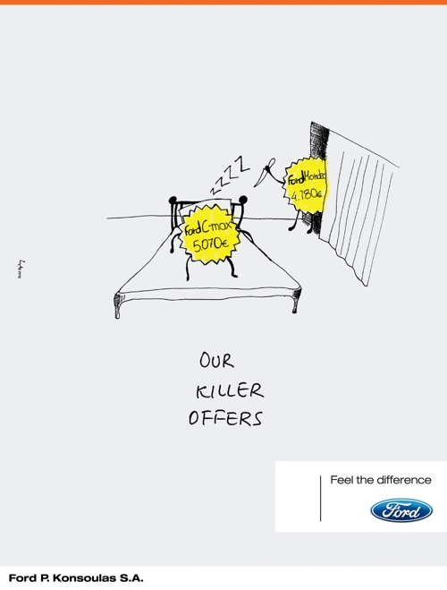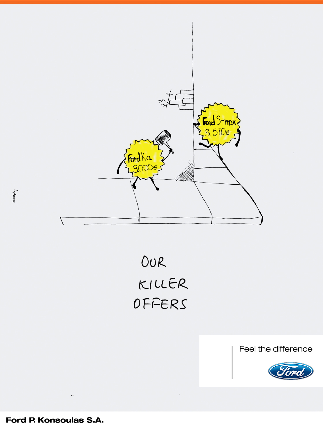 Убийственные цены от FordПечатная кампания от официальных дилеров FordВ своей новой рекламной кампании автомобильный бренд подчеркивает, что цены на его продукцию всегда стремятся к выгоде покупателя. До такой степени, что ценовая конкуренция разворачивается прямо внутри компании. "Наши предложения-убийцы", - весело сообщают принты, демонстрируя коварные действия одних ценников по отношению к другим. Что ни говори, а Ford нашел интересный способ для самопродвижения. Состав творческой группы Brand: Ford Dealers Art director: Vagelis Tolias Copywriter: Lazaros Nikiforidis |