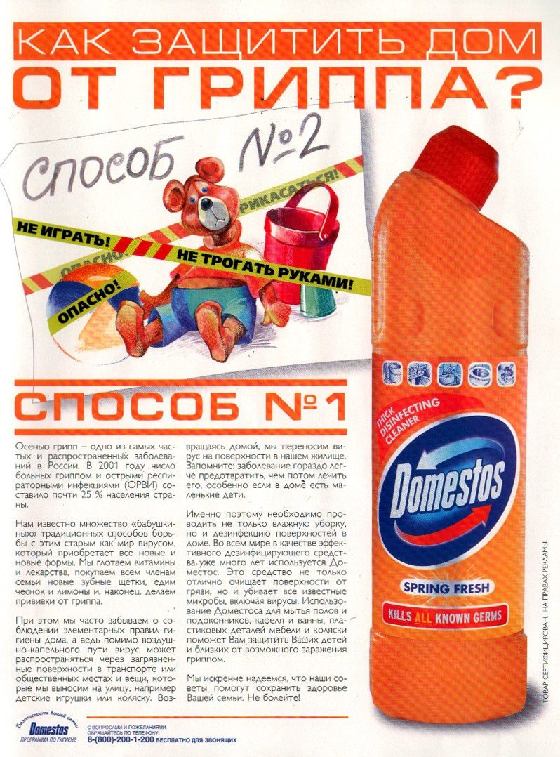 Domestos всегда делал ставку в своем позиционировании на борьбу не просто с грязью, а именно с микробами. В этом году британское агентство Lowe&Partners показало, как выглядят эти микробы. А на улицах Москвы они появились уже благодаря Media Instinct и PHD. Работать же на ниве борьбы с гриппом Domestos начал также очень давно. Еще в 2002 году в российской прессе была проведена кампания бренда, посвященная способам защиты от гриппа. Первый из которых был «Не приближаться ни к чему опасному», а второй – пользоваться Domestos.