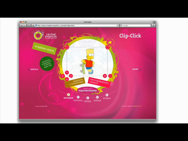 Рекламный проект реализован с использованием различных каналов коммуникации и форм игры. Это: полная адаптация контента на сайте www.herbalgirl.ru; разработка нестандартного баннера с актрисой Юлией Снигирь для cosmo.ru и .womanjournal.ru; игра "Гонки на верблюдах" в поддержку коллекции "Поцелуй Дождя"; приложение "Таинственный незнакомец", с помощью которого можно разыграть подругу, отправив ей персонализированное видео сообщение от тайного воздыхателя и в его поддержку - видео баннер на сайте знакомств mamba.ru. Особого внимания заслуживает оригинальное приложение Clip Click (принцип пульта виджея), с помощью которого любой пользователь сайта herbalgirl.ru может создать собственный клип с различными эффектами и музыкой в оригинальной аранжировке мелодий Herbal Essences. Ролик можно выслать друзьям и разместить в блоге.