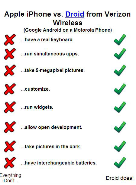 Motorola запустила рекламу против iPhoneКомпания Motorola запустила вирусную рекламу нового телефона Droid, упор в которой сделан на то, чтобы обратить внимание на недостатки iPhone.В рамках кампании Motorola опубликовала вирусный ролик, в котором перечисляет недостатки iPhone. В частности, упоминается, что у смартфона от Apple нет настоящей клавиатуры, 5-мегаписксельной камеры, сменных батарей и открытого рынка приложений. Заканчивается же ролик фразой "Everything iDon't Droid Does" ("Все, что не могу я, делает Droid") и дается ссылка на сайт DroidDoes.com. На сайте же проводится своеобразное сравнение возможностей Motorola Droid и iPhone, явно намекающее на недостатки последнего и призывающее покупателей сделать выбор в пользу Motorola Droid.