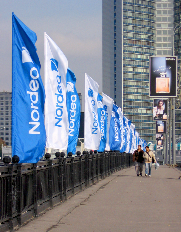 Флаги как наружная рекламаКампания Nordea от "Московской городской рекламы""Московская Городская Реклама" проводит имиджевую кампанию для "Нордеа Банк", входящего в скандинавскую банковскую группу Nordea. Согласно фирменному стилю Nordea, флаги изготовлены в двух вариантах - логотип банка размещен на белом и на синем фоне. Всего в кампании задействовано более 500 флагов на основных трассах и мостах города. Акция проходит с 12 по 21 октября и приурочена к интеграции банка в группу Nordea. |