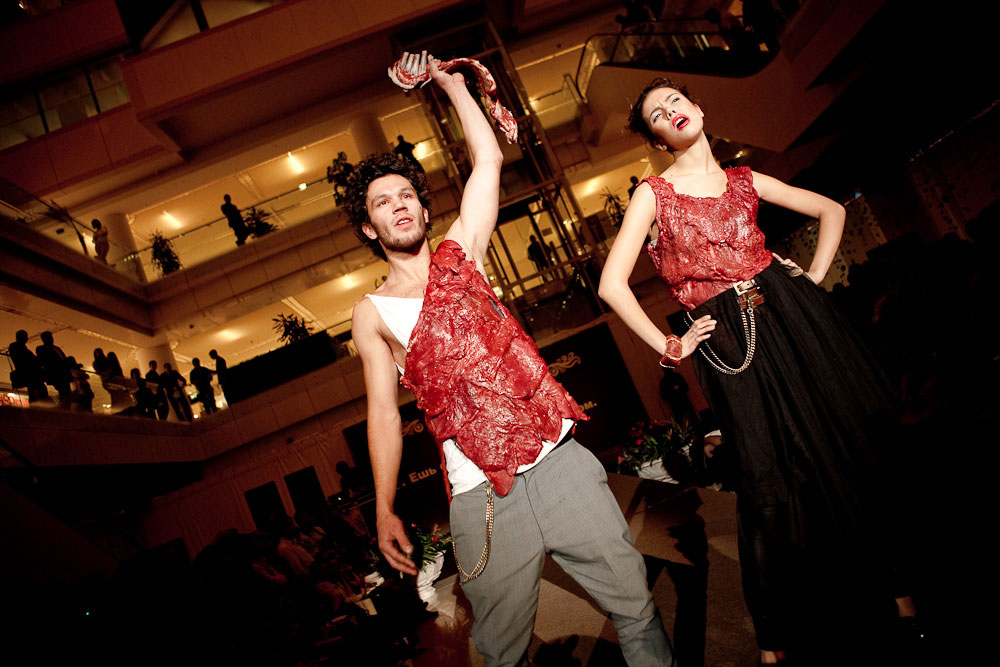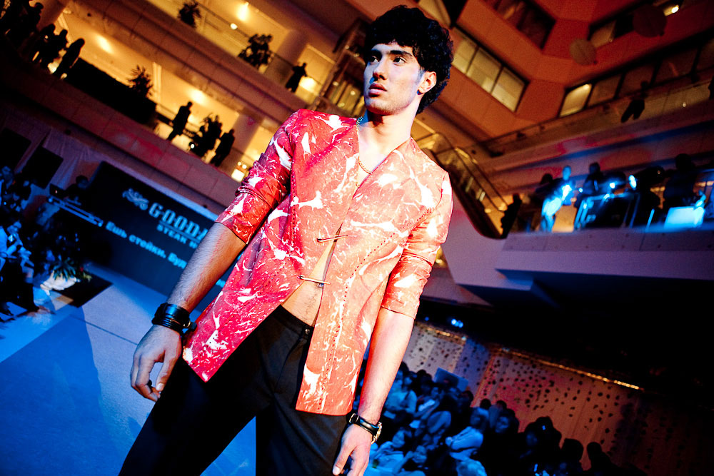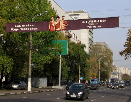 Мясо висит на улицахНаружка "Мясной" промо-акции GoodmanПо заказу агентства Riks для ресторана Goodman Московская Городская Реклама изготовила и разместила 8 перетяжек на основных магистралях столицы. Особенностью кампании стало использование нестандартных элементов на всех восьми перетяжках. Пластиковые экстендеры выполнены в виде трех человек в одежде из стейков. Кампания приурочена к октябрьской акции стейк-хауса "Ешь стейки. Будь человеком". Центральное событие кампании - BTL показ "Праздник стейка", который состоялся 15 октября 2009 года в Новинском Пассаже. Сеть стейк-хаусов Goodman решила таким образом дань уважения мясу - флагманскому продукту ресторанов. На подиуме модели были частично одеты в наряды, сделанные из настоящего мяса. Именно этот образ - человека, одетого в мясо и был использован в наружной кампании Goodman. |