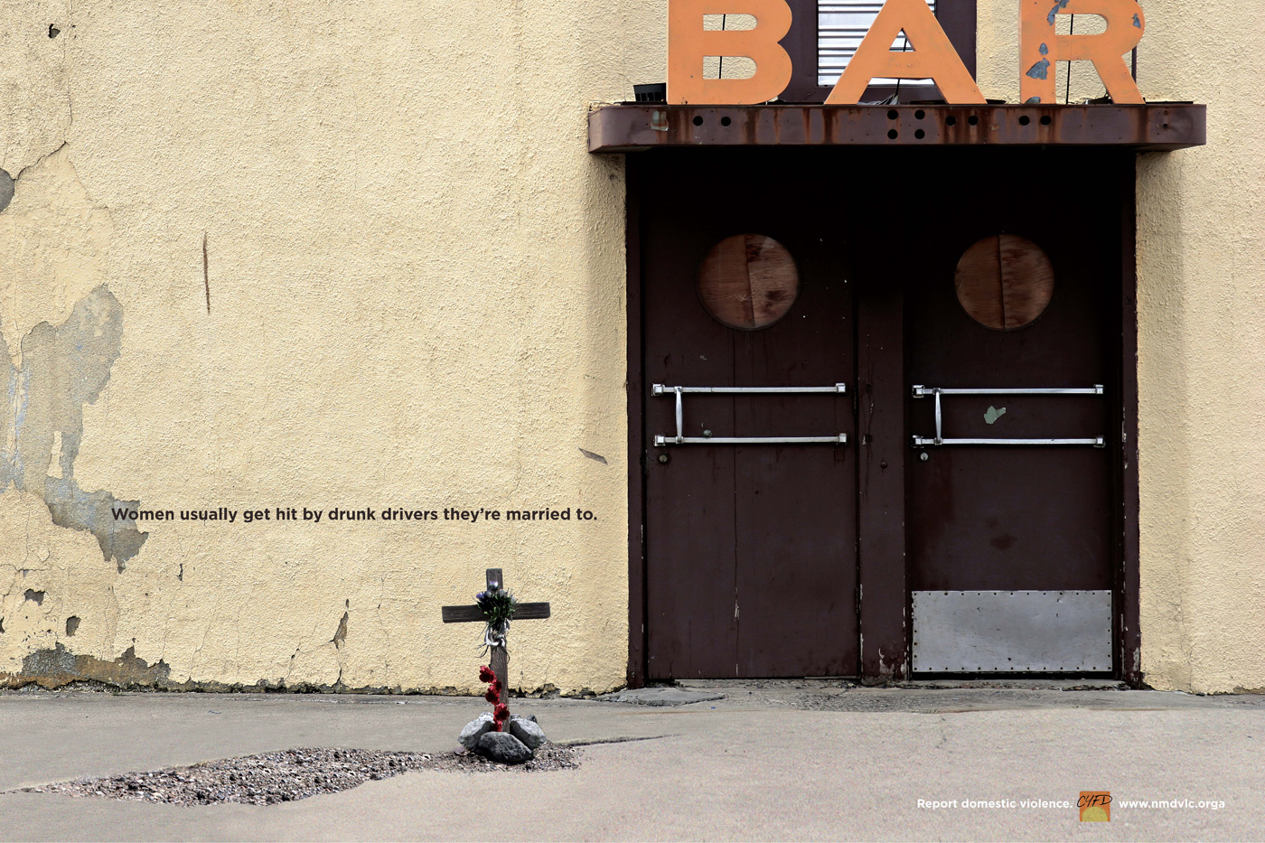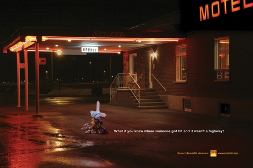 Кто и где был "сбит"Социальная реклама против насилия в семьеАмериканское агентство Smugglers' Inn разработало печатную кампанию для Департамента по делам детей, молодежи и семьи штата Нью-Мексико. Используя игру слов - "hit" по-английски означает и избиение, и наезд на пешеходов - реклама обращает внимание общественности на то, что ежедневно дети и женщины подвергаются насилию в самых обычных местах, таких как бары, мотели и даже общественные прачечные. Но большинство не обращают на это внимание и не задумываются об этой проблеме, точно так же как не думают о том, сколько людей погибает каждый день под колесами автомобилей. Что, если бы вы знали, где кто-то был "сбит", и это было бы не шоссе?