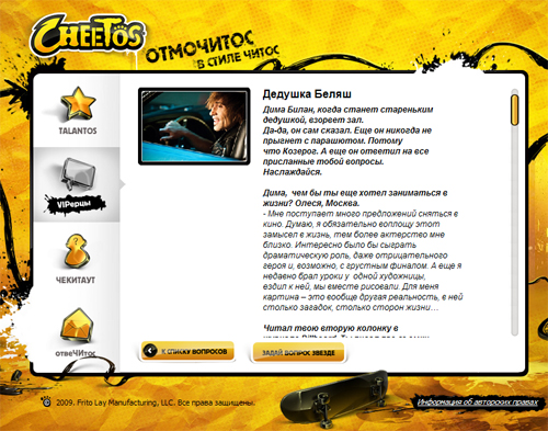 Новый ролик Cheetos от BBDO MoscowДима Билан продолжает «Отмочитос»В середине августа было объявлено, что популярный певец Дима Билан станет лицом бренда Cheetos - кукурузных чипсов. Производитель - компания Frito-Lay. По неподтвержденным данным, сумма контракта должна была составить порядка 1 миллиона долларов. В сентябре, как и было анонсировано, появились два похожих ролика – «Стадион» и «Спортзал». Дима Билан предстал пред зрителями в двух «вариантах» - «взрослом» и «детском». Сейчас в эфир вышел еще один ролик от BBDO Moscow – на этот раз, он промотирует акцию «Читоса» на сайте otmocheetos.ru. Тем временем, Дима Билан вошел в пятерку финалистов номинации «Лучший европейский артист» MTV EMA 2009. Впервые в истории церемонии по итогам общеевропейского голосования в финал MTV EMA вышел представитель России. Вместе с ним за эту номинацию будут сражаться представители еще четырех стран: Финляндии, Италии, Польши и Турции. Кто именно стал победителем, станет известно лишь во время Церемонии 5 ноября в Берлине. В этом году церемония MTV EMA 2009 приурочена к юбилею падения Берлинской стены.