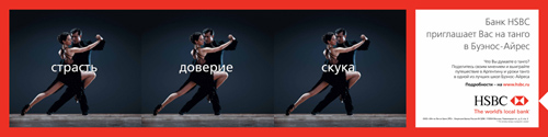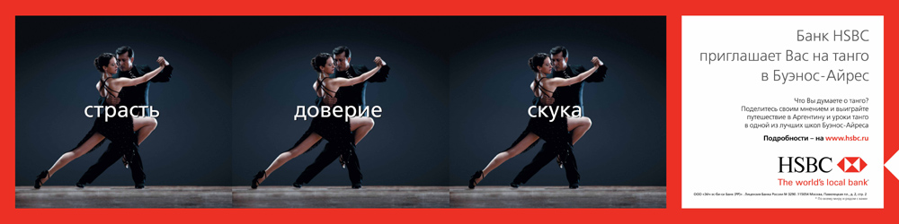 Для объяснения философии банка запущен интерактивный проект - промокампания "Что вы думаете о танго?". Любой желающий может зайти на сайт HSBC, ответить на вопрос, что значит танго именно для него, и выиграть приз - поездку в Аргентину в школу Танго.