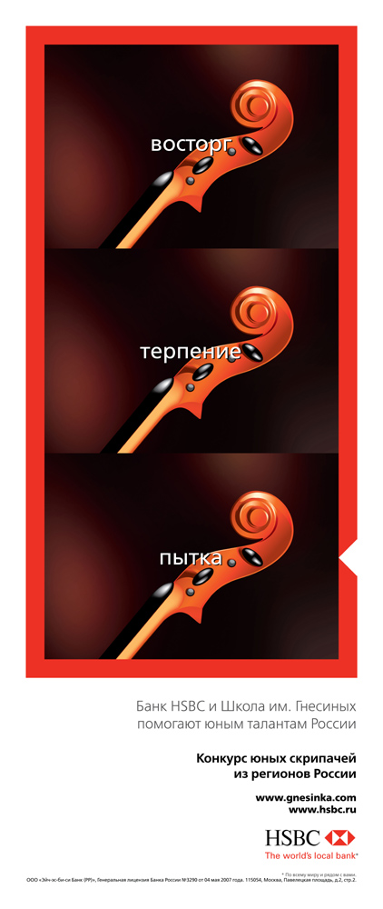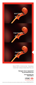 Кроме того, HSBC объявил о поддержке новых талантов в России в интерактивном проекте "Музыкальное училище им. Гнесиных". "Музыкальное училище им. Гнесиных" является одной из ведущих музыкальных школ в Москве с более чем столетней историей. Поддерживая конкурс, в котором могут принять участие юные скрипачи из регионов, HSBC заявляет о себе не только как о банке с многолетней историей, но и как о банке, понимающем культуру России. В рамках кампании были созданы интернет-баннеры, сайт проекта, постеры и роллапы.