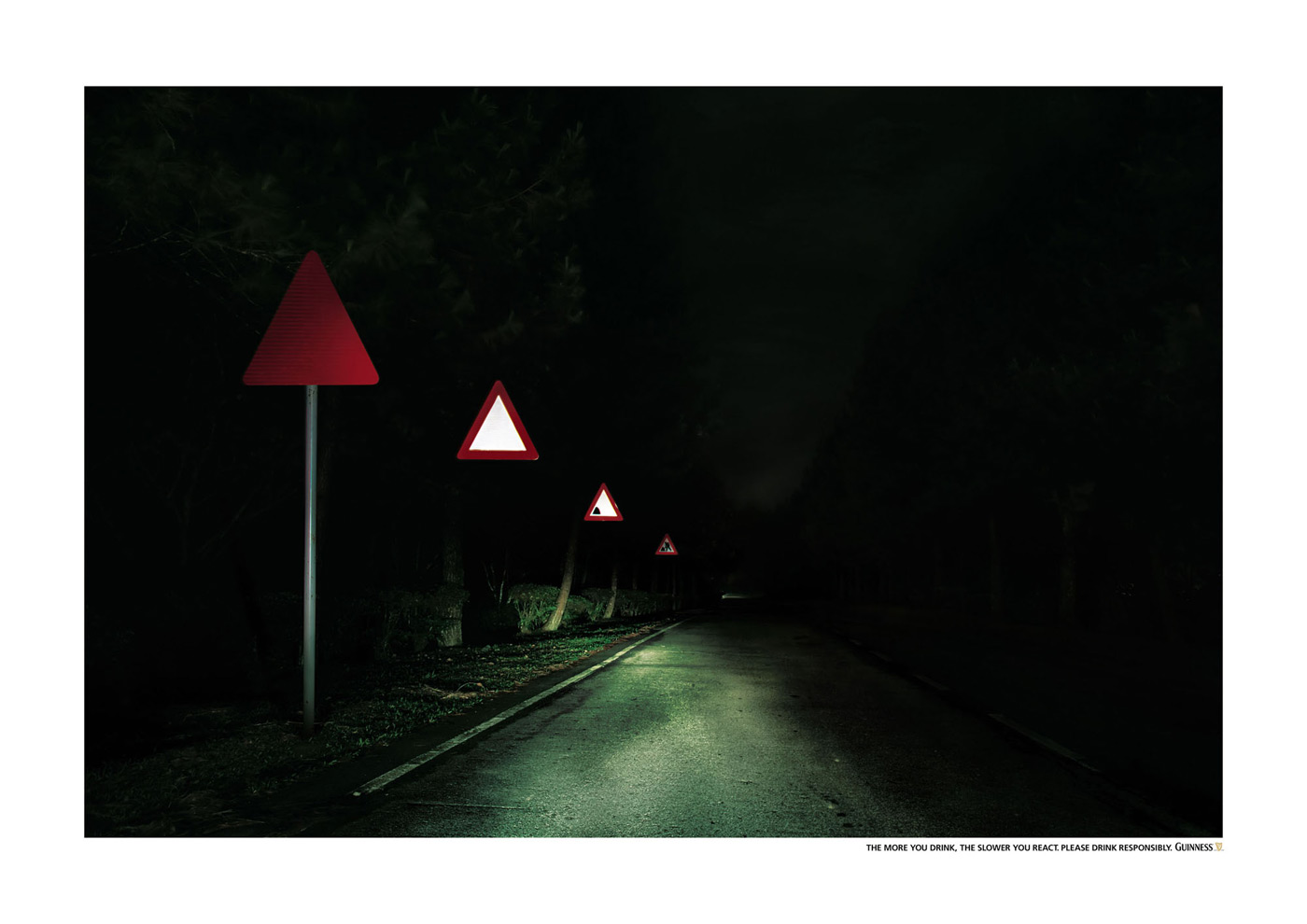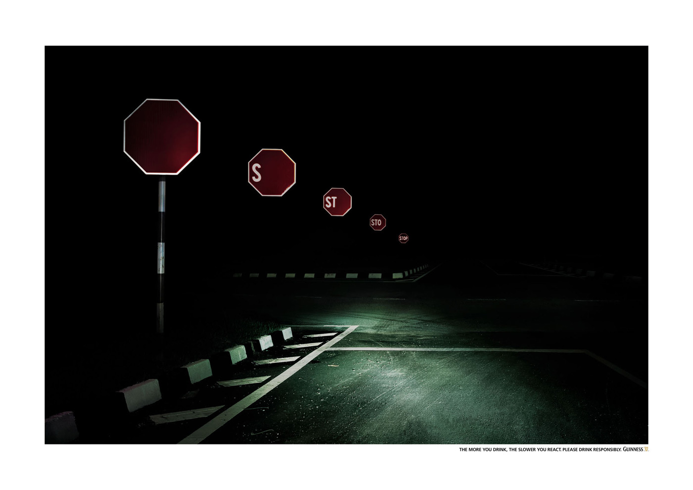 Пей Guinness ответственноРекламная кампания, призывающая знать меруНа каждой банке и бутылке популярного пива "Guinness" имеется призыв подходить к употреблению напитка ответственно. Малазийское Saatchi & Saatchi использовало этот же посыл в серии принтов социальной направленности. Слоган кампании "Чем больше вы выпили, тем медленнее ваша реакция. Пожалуйста, выпивайте ответственно" изящно проиллюстрирован несколькими дорожными знаками, стоящими друг за другом - так визуализировано заторможенное восприятие пьяного водителя всего лишь одного знака, который "доходит" слишком поздно. Состав творческой группы Advertising Agency: Saatchi & Saatchi, Petaling Jaya, Malaysia Executive Creative Directors: Adrian Miller, Edmund Choe Copywriter: Christie Herman Art Director: Ong Kien Hoe Photographer: Alex Tow ( threesixty° Photography) |