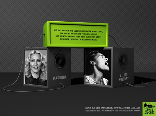 Майкл Джексон = Луи АрмстронгРеклама джазового фестиваля, уравнявшая музыкантов и стилиБразильское агентство Filadelfia создало рекламную кампанию для музыкального фестиваля "I love Jazz", использовав образы знаменитых современных певцов и великих джазовых исполнителей. Реклама направлена как на ценителей джаза, так и на любителей иных музыкальных стилей. Достаточно простые по исполнению принты проводят прямые сравнения между музыкантами прошлого и современности, чтобы привлечь как можно больше слушателей на "I love Jazz Festival". Он вступил в группу в 11 лет. В качестве сольного исполнителя, он записывал незабываемые альбомы. Он умер от обширного инфаркта. И для фанатов и критиков он всегда будет королем. Видите? Если вы любите поп-музыку, вы наверняка полюбите джаз. Она родилась в пригороде, а затем переехала в Нью-Йорк. Она упорно трудилась, чтобы заработать на жизнь. Она захватила толпу своим голосом. И сделала "Holiday" бытовым названием. Видите? Если вы любите танцевальную музыку, вы наверняка полюбите джаз. Он известен под своим прозвищем. Его голос неподражаем. Он разделял сцену с величайшими музыкальными звездами. И стал поддерживать социальные инициативы. Видите? Если вы любите рок-н-ролл, вы наверняка полюбите джаз. Состав творческой группы Advertising Agency: Filadelfia, Brazil Creative Director: Dan Zecchinelli Art Director: Marcio Doti Copywriter: Leandro Neves Illustrator: Aderson Fagundes |