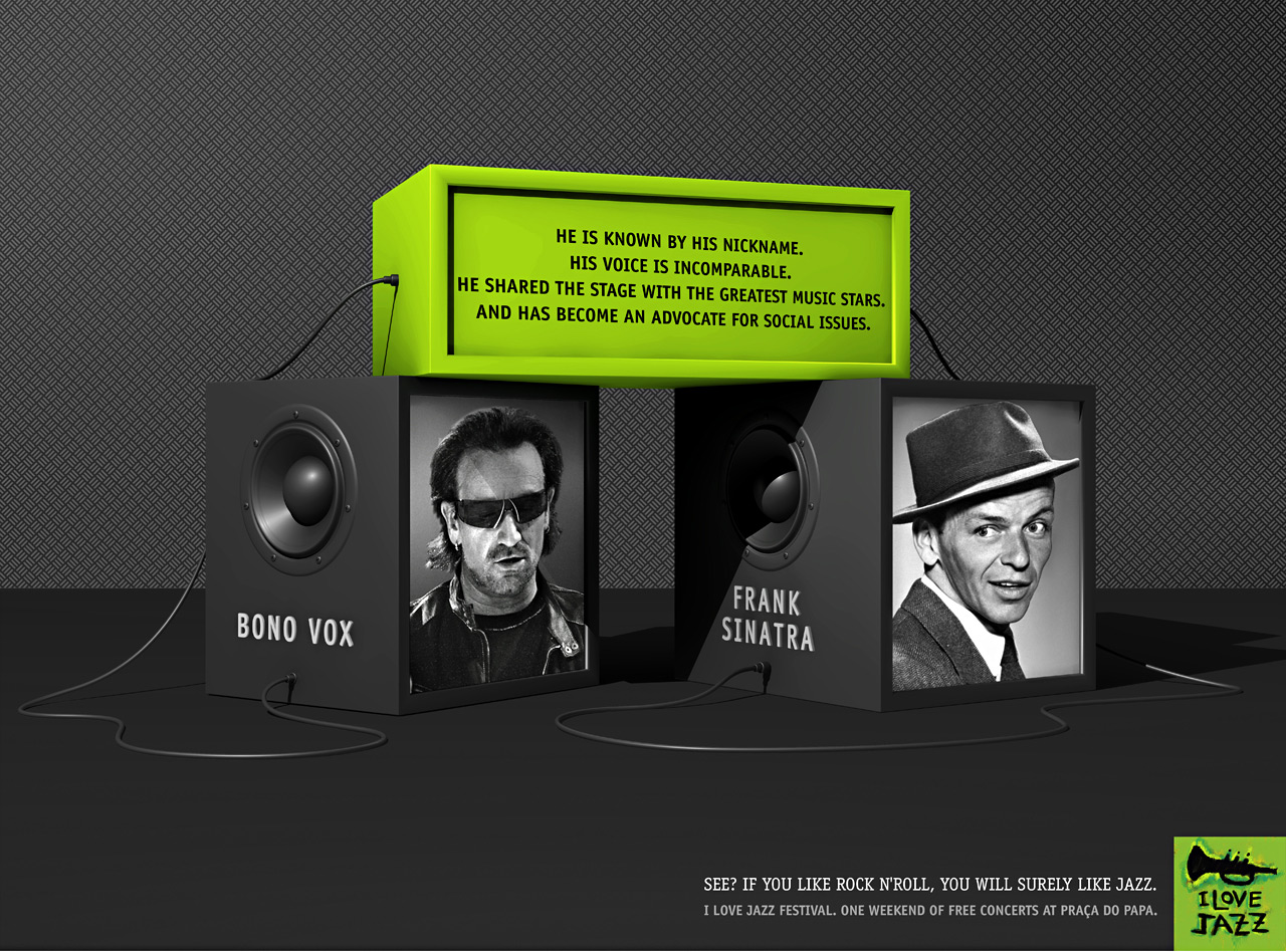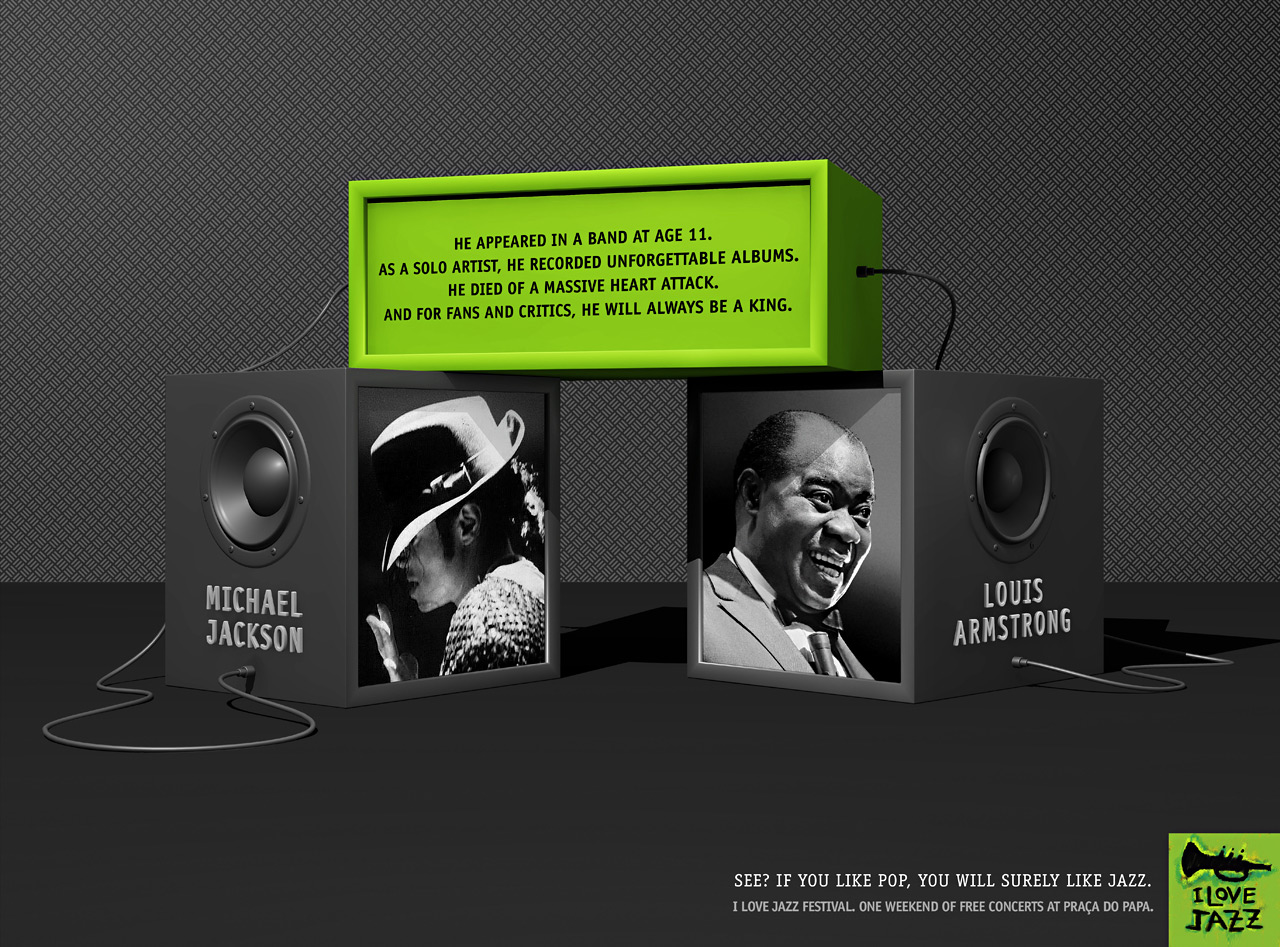 Майкл Джексон = Луи АрмстронгРеклама джазового фестиваля, уравнявшая музыкантов и стилиБразильское агентство Filadelfia создало рекламную кампанию для музыкального фестиваля "I love Jazz", использовав образы знаменитых современных певцов и великих джазовых исполнителей. Реклама направлена как на ценителей джаза, так и на любителей иных музыкальных стилей. Достаточно простые по исполнению принты проводят прямые сравнения между музыкантами прошлого и современности, чтобы привлечь как можно больше слушателей на "I love Jazz Festival". Он вступил в группу в 11 лет. В качестве сольного исполнителя, он записывал незабываемые альбомы. Он умер от обширного инфаркта. И для фанатов и критиков он всегда будет королем. Видите? Если вы любите поп-музыку, вы наверняка полюбите джаз. Она родилась в пригороде, а затем переехала в Нью-Йорк. Она упорно трудилась, чтобы заработать на жизнь. Она захватила толпу своим голосом. И сделала "Holiday" бытовым названием. Видите? Если вы любите танцевальную музыку, вы наверняка полюбите джаз. Он известен под своим прозвищем. Его голос неподражаем. Он разделял сцену с величайшими музыкальными звездами. И стал поддерживать социальные инициативы. Видите? Если вы любите рок-н-ролл, вы наверняка полюбите джаз. Состав творческой группы Advertising Agency: Filadelfia, Brazil Creative Director: Dan Zecchinelli Art Director: Marcio Doti Copywriter: Leandro Neves Illustrator: Aderson Fagundes |