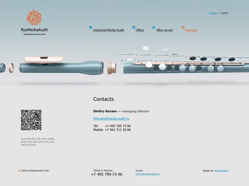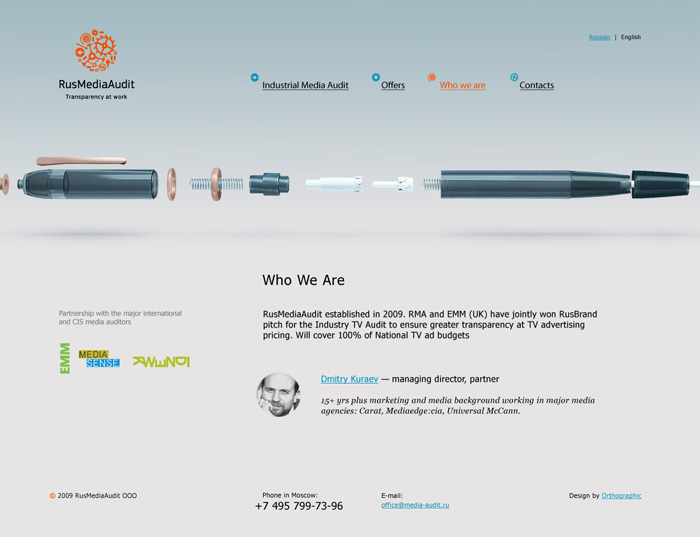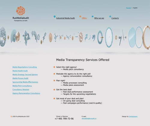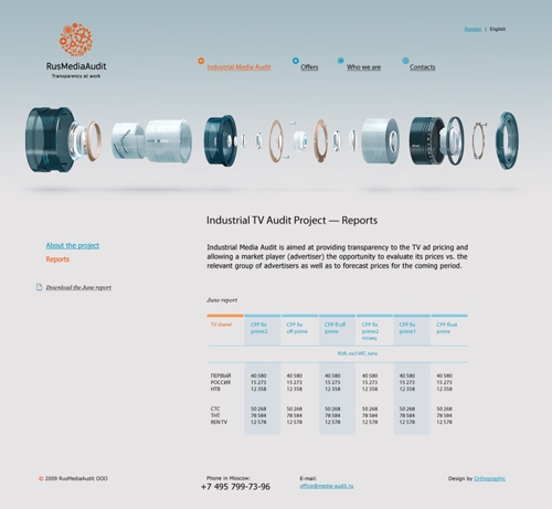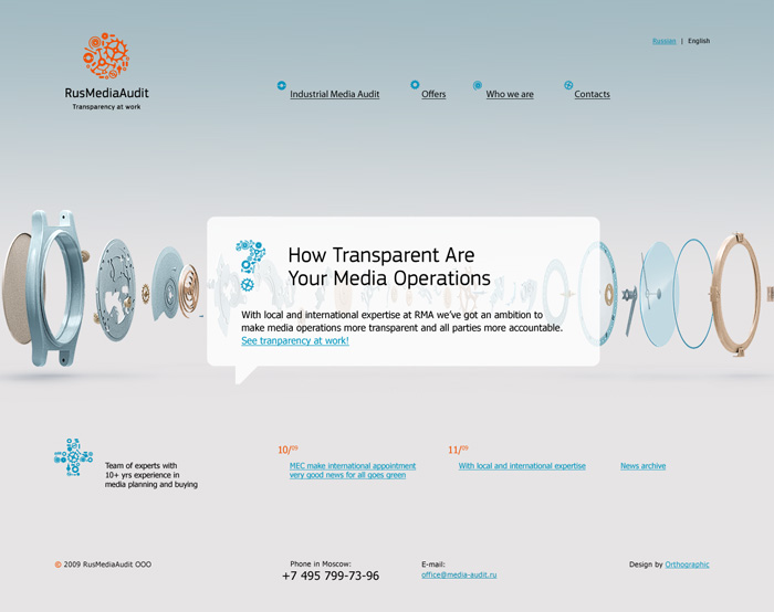 Сайт компании "РусМедиаАудит"Созданный в рамках проекта "Орфографика"Начал работу сайт компании "РусМедиаАудит", разработанный Сергеем Мосякиным (в рамках собственного проекта "Орфографика"). Изначально, помимо логотипа или фирменной графики, была задача найти графическую идею, которая смогла бы отразить деятельность аудиторской компании и объединить все коммуникации компании "РусМедиаАудит". Понимая специфику деятельности заказчика, разработчик благополучно забыл про деловую документацию и сосредоточился на основных имиджевых носителях: презентации и сайте. В результате была придумана метафора аудиторской деятельности - разбор сложного механизма, учет каждой детали и исследование механизма на предмет повреждений. Логотип и оформление презентации ранее публиковались на Составе, теперь же придуманная идея нашла развитие в сайте компании. Состав творческой группы: Арт-директор, дизайнер, техдизайнер: Сергей Мосякин Моделлер: Роман Сумцов Программист: Александр Valeen |