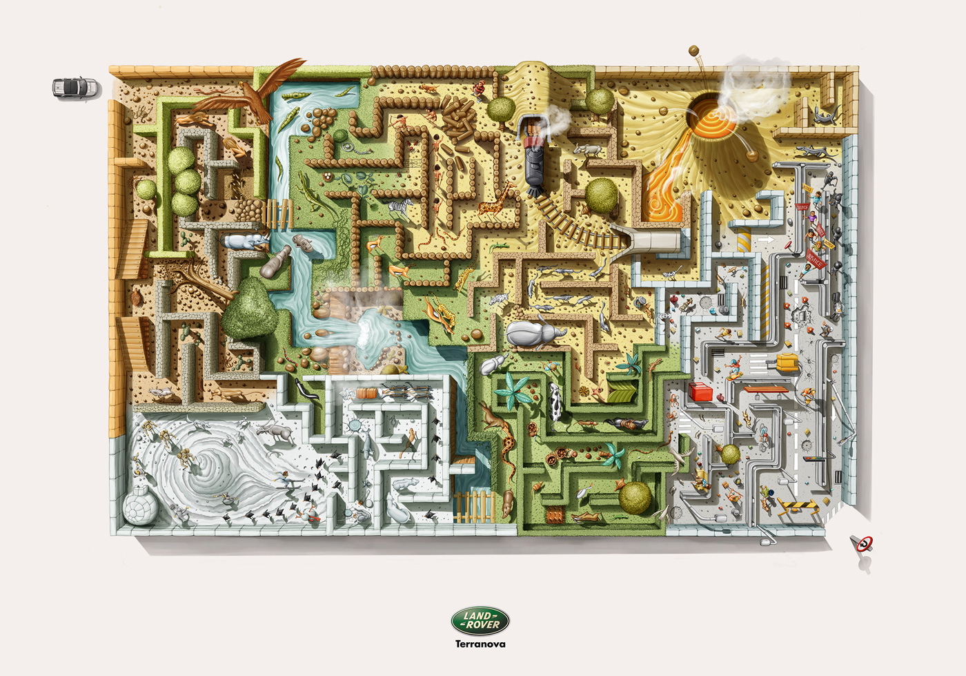 Terranova - лабиринт неисследованногоРеклама дилера Land Rover из БразилииАгентство Filadelfia из Белу-Оризонте создало простенькую, но интересную кампанию для бразильской компании Terranova, которая многие годы является дилером автомобилей Land Rover в стране. Принт изображает красочный лабиринт, в котором собраны самые разнообразные местности: от пустынь и тропиков до городских улиц. Даже без слов понятно, что только Land Rover способен пройти через все это. Ранее Filadelfia предлагало свой вариант идеального для Land Rover мира, в котором материки превратились в океаны, а океаны - в материки. Состав творческой группы Advertising Agency: Filadelfia, Belo Horizonte, Brazil Creative Director: Dan Zecchinelli Art Director: Marcio Doti Copywriter: Leandro Neves Illustrator: Aderson Fagundes |