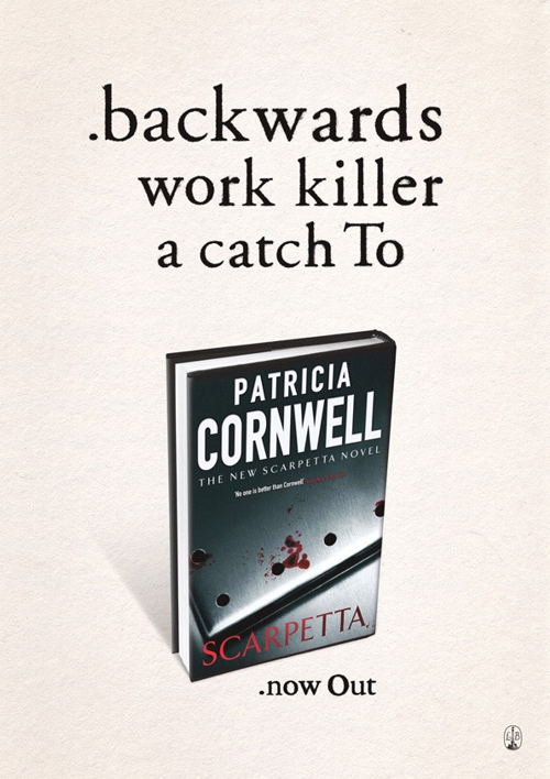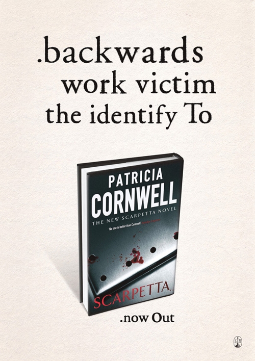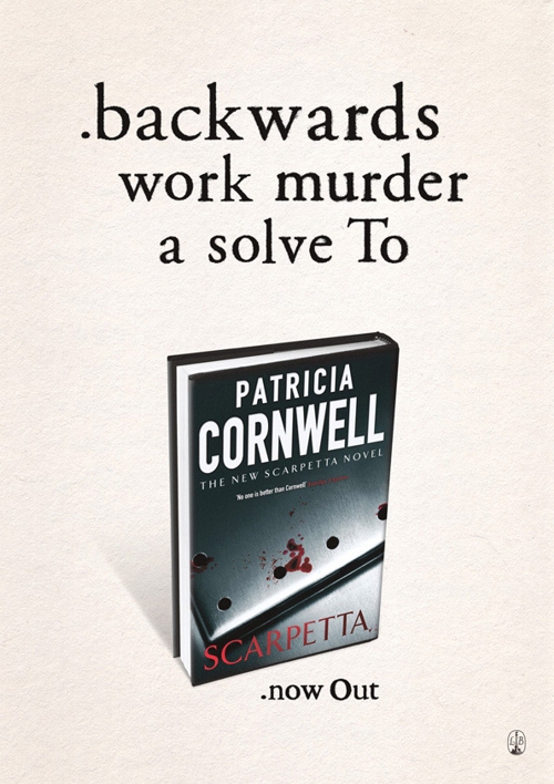 Жертва, убийство и убийца на принтахРеклама нового детектива Патрисии КорнуэллАвстралийское агентсво US Sydney выпустило серию принтов для рекламы новой книги популярной писательницы Патрисии Корнэулл, прославившейся своими детективами. Чтобы привлечь внимание к новому роману из серии о детективе Кей Скарпетта, агентство решило подчеркнуть, что он настолько интересен, что читатели рискуют позабыть о своей работе, увлекшись чтением.