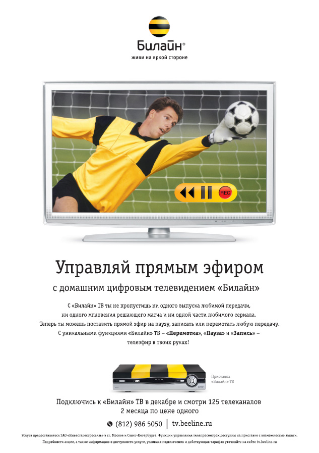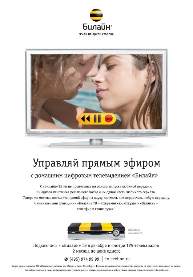 Поставь "Билайн"-ТВ на паузуКампания от Lowe AdventaС 7 декабря "Билайн" запускает новую рекламную кампанию, посвященную Домашнему цифровому телевидению. В отличие от существующих аналогов на рынке новый продукт от "Билайн" - Домашнее цифровое телевидение - обладает уникальными функциями управления телепросмотром: запись, пауза, перемотка. Каждый клиент, подключивший "Билайн" ТВ, может перемотать назад любую передачу, идущую в прямом эфире; может поставить программу на паузу и затем продолжить просмотр с того же момента. Кроме того, телезритель сможет записать одновременно до 4 программ, идущих на разных каналах. В эфире региональных телевизионных блоков Москвы и Санкт-Петербурга, а также на неэфирных каналах появятся сразу два рекламных ролика. Идея роликов близка каждому: когда мы смотрим прямой эфир, есть риск пропустить важный момент или не успеть к началу. В таких случаях обычно стоит надеяться только на то, что кто-то расскажет о пропущенном эпизоде. И не факт, что расскажет хорошо и понятно. С "Билайн" ТВ и его функциями управления прямым эфиром такой ситуации быть не может. Первый ролик "Сериал" рассказывает о функциях "Запись" и "Перемотка". Второй ролик "Футбол" - о функциях "Пауза" и "Перемотка". И обе истории показывают то, что теперь можно совершенно не опасаться плохих рассказчиков. В продвижении будет также задействована пресса и Интернет. Кампания продлится до 3 января 2010 года. Состав творческой группы: АГЕНТСТВО Lowe Adventa Креативный директор: Маркус Джексон Арт-директор: Наталья Крючкова/ Анна Извольская Копирайтер: Георгий Акатов/ Андрей Левин Продюсер: Юрий Медведев Груп аккаунт директор: Александра Бирюкова Аккаунт директор: Анна Афанасенко ПРОДАКШН Park Production Режиссер: Danny Boyle Продюсеры: Арам Петросян/Вадим Колосов "БИЛАЙН" Начальник отдела рекламы: Мария Яковлева Менеджер по рекламе Ирина Пашкина |