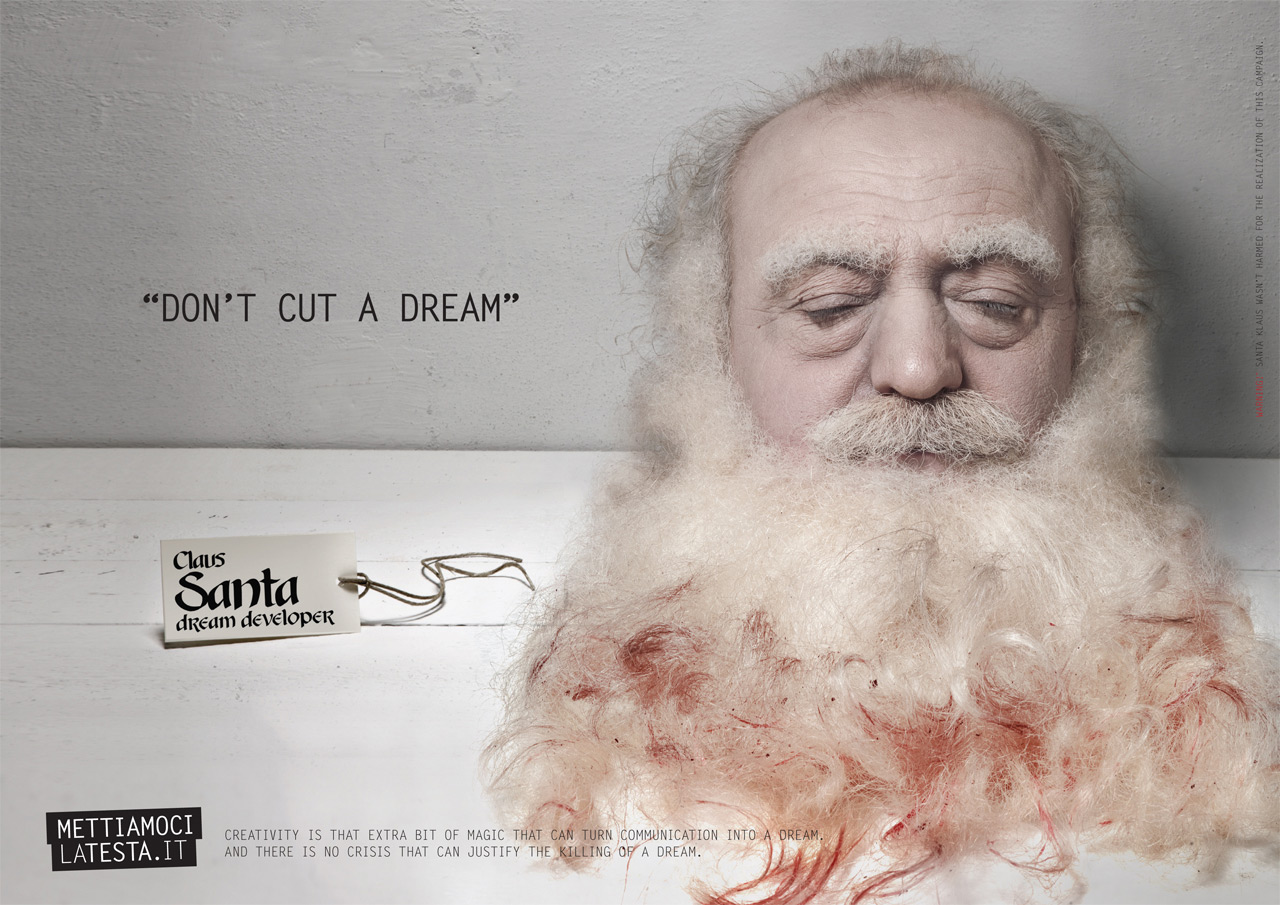 Отрезанная голова Санты против финансовых ограничений рекламыКампания итальянского агентства Milc"Творчество - это небольшой кусочек магии, который способен превратить коммуникации в мечты. И нет такого кризиса, которым можно оправдать убийство мечты", - считает креативное агентство Milc из Италии. Агентство запустило необычную веб-кампанию, которая базируется на сайте www.mettiamocilatesta.it , направленную против снижения рекламных инвестиций в период экономического кризиса. В центре коммуникации - отрезанная голова добряка Санта Клауса, которая символизирует попытку ограничения креативности рекламистов, а значит - попытку разрушения мечты. Состав творческой группы Advertising Agency: Milc, Siena, Italy Creative Director: Giampiero Cito Art Director: Matteo Scheggi Copywriter: Matteo Spadoni Photographer: Bruno Bruchi Strategic planner: Antonio Paolo |