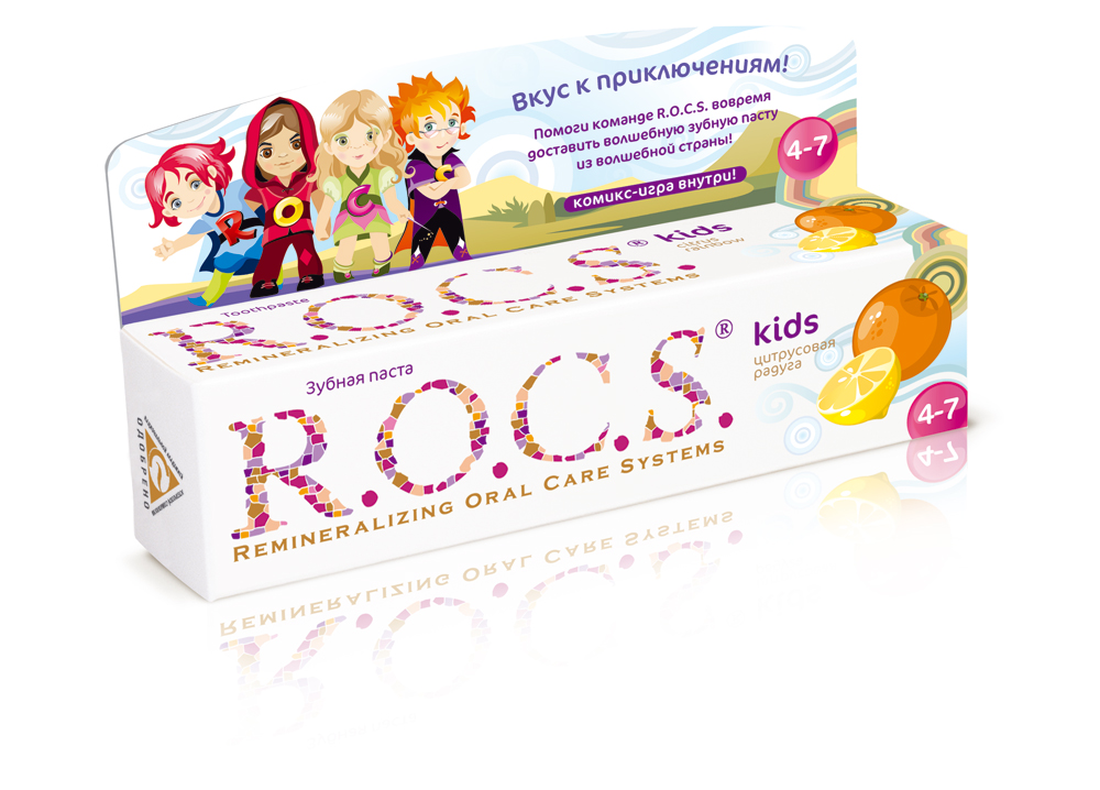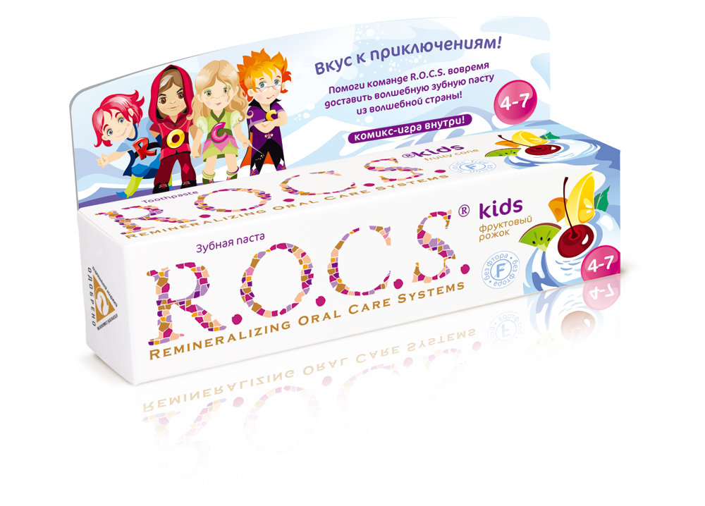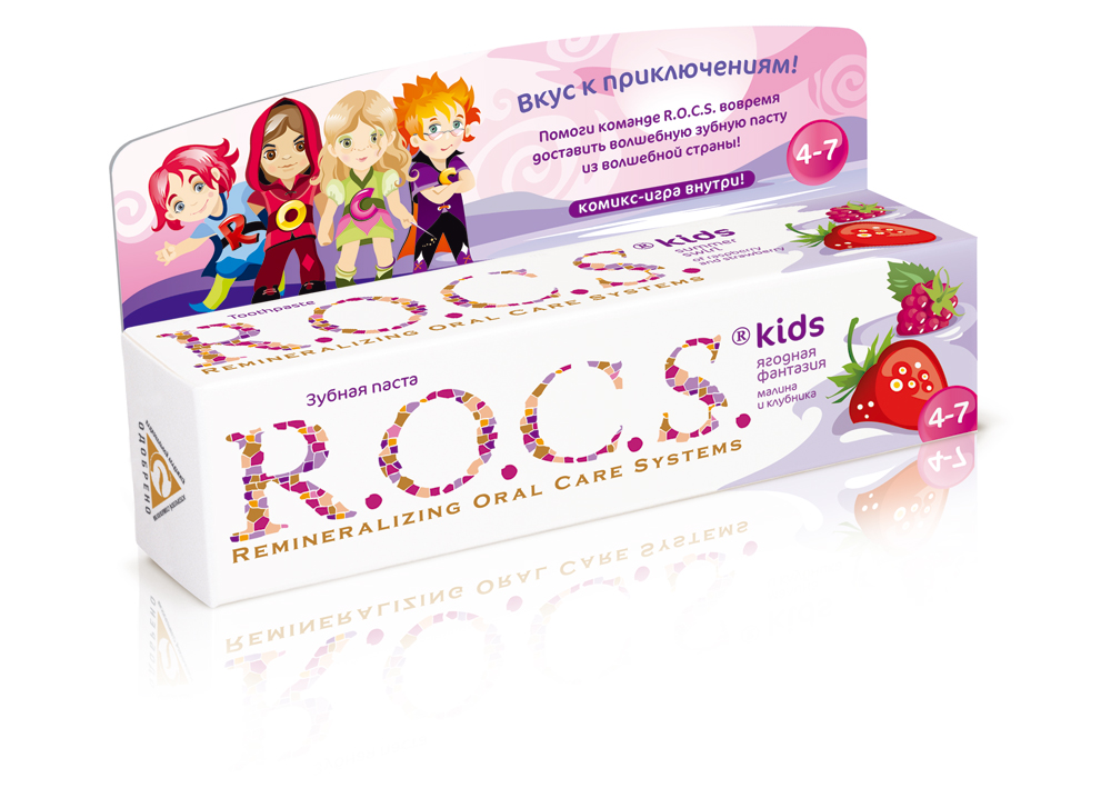 R.O.C.S.: у приключений вкус зубной пастыРестайлинг детской линейкиНачатый в начале текущего года рестайлинг торговой марки R.O.C.S. (владелец - компания "DRC") продолжился и коснулся линейки продуктов для детей. К новому году полностью обновлены зубные пасты серии R.O.C.S. Kids для детей от 4 до 7 лет. Бренд-персонажами марки, название которой расшифровывается как "Remineralizing Oral Care Systems", стали Рон, Остин, Кати и Саймон. С упаковки герои рассказывают, как делается зубная паста. Внутрь вложены комикс-игра о приключениях героев, раскраска, календарь чистки зубов и магнит. Поскольку в таком же дизайне продукция теперь продается в Германии, Финляндии и странах Балтии, на новых упаковках, согласно европейскому законодательству, еще больше места отведено под информацию для родителей, профессиональную информацию о составе, клинических исследованиях и безопасности продуктов. Линейка вкусов включает в себя "Ягодную фантазию" со вкусом малины и клубники, 45 гр.; "Цитрусовую радугу" со вкусом апельсина, лимона и ванили, 45 гр.; "Бабл гам" со вкусом жевательной резинки, 45 гр.; "Фруктовый рожок" без фтора, со вкусом мороженного, 45 гр. Новый слоган детской серии "R.O.C.S. Kids - вкус к приключениям!" |