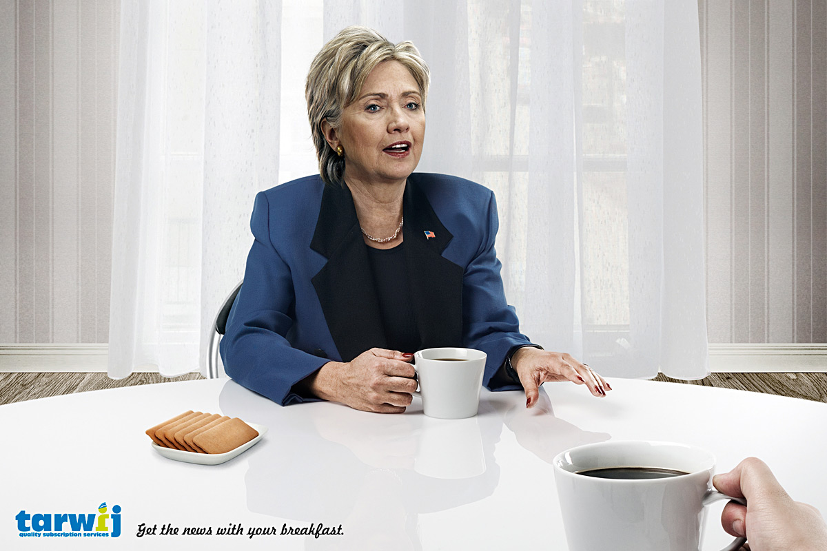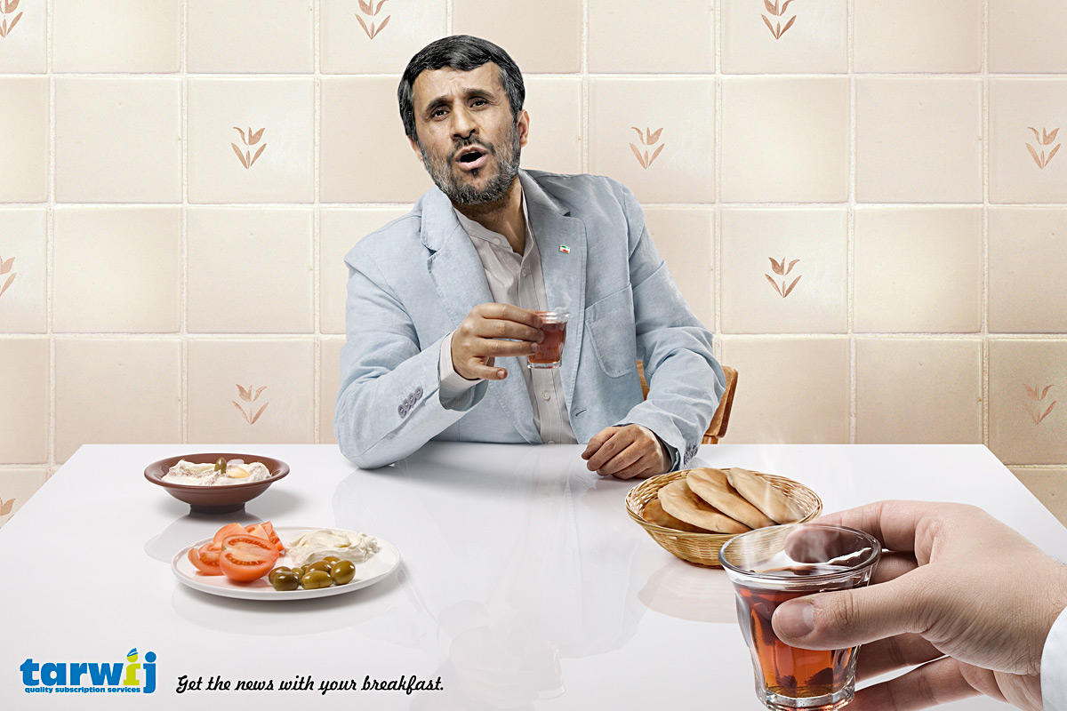 Завтрак с СаркозиРеклама ливанской службы подпискиImpact BBDO из Бейрута создало рекламу для ливанской компании Tarwij, которая осуществляет подписку на газеты и своевременную их доставку. Чтобы подчеркнуть то, что новости всегда свежие агентство использовало образы известных политиков: Николя Саркози, Хилари Клинтон и Махмуд Ахмадинеджад. "Получите новости вместе с завтраком", - гласит слоган кампании. В соответствии с ним принты изображают, что завтракать клиенты Tarwij будут с самими политиками, о которых пишут в газетах. Состав творческой группы Advertising Agency: Impact BBDO, Beirut, Lebanon Executive Creative Director: Walid Kanaan Senior Art Director: Hovsep Guerboyan Copywriter: Malak Makki Photographer: Astrid Challita |