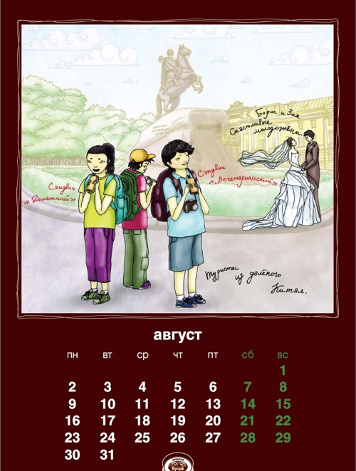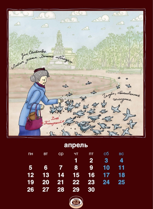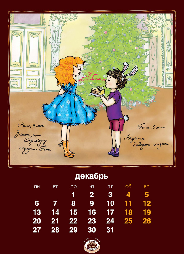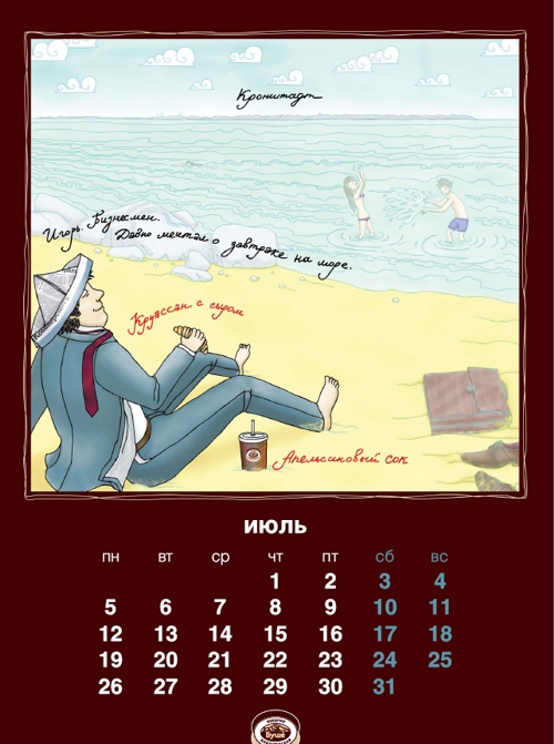 "Такилииначе": маленькие истории из жизни горожанКреативная студия "Такилииначе" нарисовала для корпоративного календаря на 2010 год петербуржской сети пекарен-кондитерских "Буше" маленькие истории из жизни горожан, в каждой из которых нашлось место для продукции компании.Обыденные ситуации и узнаваемые моменты, неотъемлемой частью которых являются любимые в городе изделия "Буше" -- такова концепция этого забавного и яркого календаря. Ведь свежий хлеб и воздушная булочка, нежное пирожное и кусочек таящего во рту торта - это те повседневные мелочи, которые делают нашу жизнь по-настоящему приятной. Состав творческой группы: Идея и копирайтинг: Сеть пекарен-кондитерских "Буше" Директор по маркетингу: Ирина Жук Менеджер по маркетингу: Анастасия Паршукова Реализация идеи: Креативная студия "Такиилииначе" Арт-директор: Ольга Дамме Аккаунт-директор: Юлия Докторова Иллюстратор: Наташа Цозик Бренд: Сеть пекарен-кондитерских "Буше" |