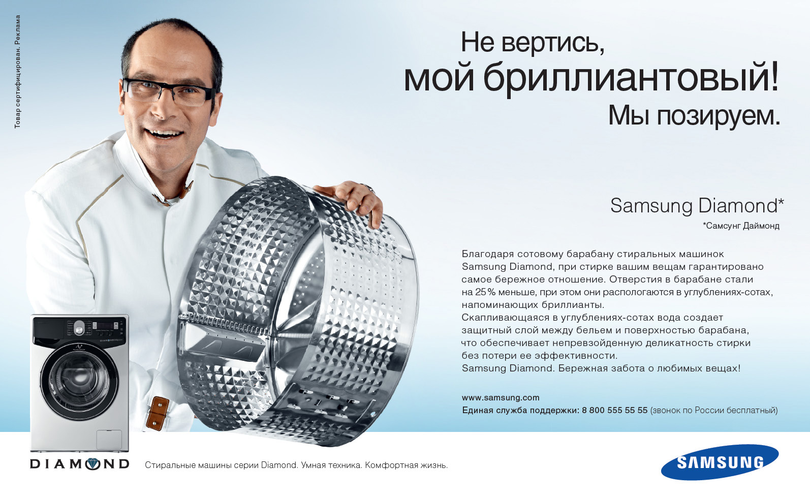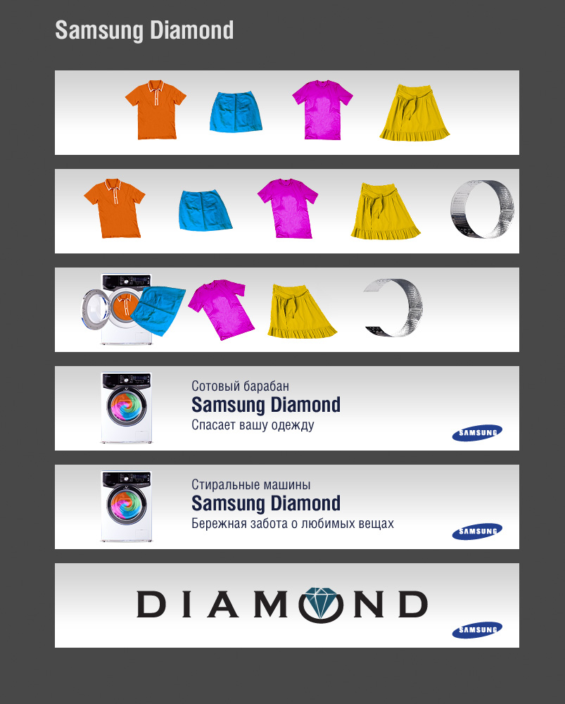 Основной информационный акцент сделан на уникальной технологической новинке, использованной в сотовом барабане стиральной машины Samsung Diamond. Отверстия в барабане (они на 25% меньше отверстий обычного барабана стиральных машин) по форме напоминают грани бриллианта, благодаря чему обеспечивается деликатность стирки без потери её эффективности.