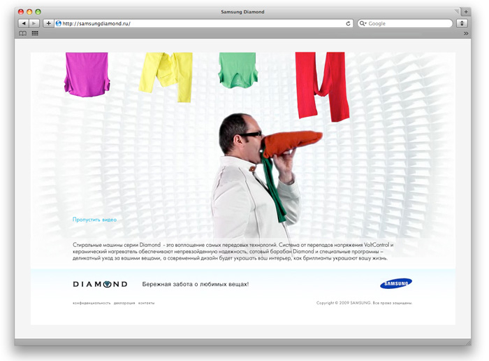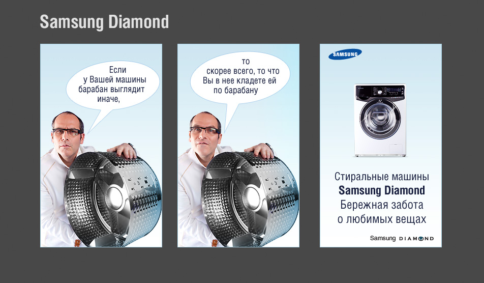 Основная цель данной коммуникации - привлечь внимание потребителя к новой модели стиральной машины Samsung Diamond. Задача перед Leo Burnett Moscow стояла очень непростая - как в огромном конкурентном поле стиральных машин известных марок удивить потребителя и привлечь его внимание к новинке. Решение агентства простое и выигрышное: обрамить уникальные особенности новой стиральной машины в юмор.