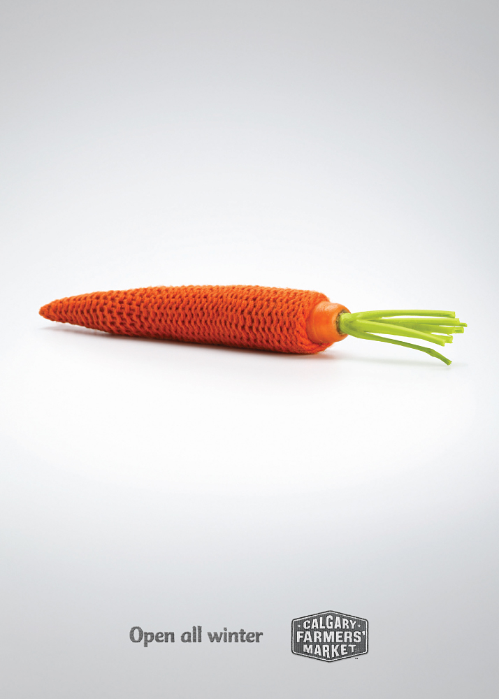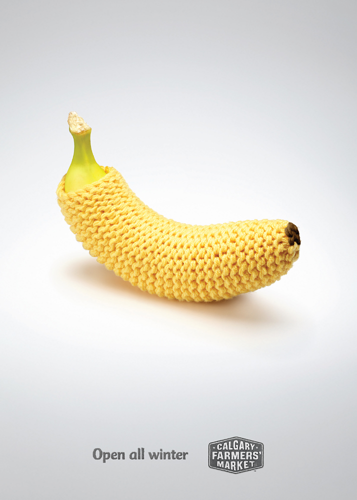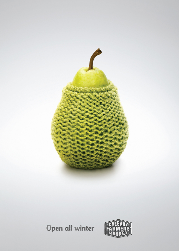 Универмаг Farmers' Market хранит фрукты в теплеКампания привлечения покупателей в зимний периодКанадское агентство WAX Partnership разработало печатную кампанию для универмага Farmers' Market в городе Калгари. Согласно брифу, агентству необходимо было сообщить людям, что универмаг будет работать в обычном режиме и продолжать торговлю свежими овощами и фруктами в течение всего зимнего периода. Для этого креативщики решили использовать образ продуктов в шерстяных одежках. Слоган довольно прост: "Открыто всю зиму". Состав творческой группы Advertising Agency: WAX Partnership, Canada Creative Directors: Sebastien Wilcox, Joe Hospodarec Art Director: Brad Connell Copywriter: Andrew Payne Photographer: Ken Woo Knitter: Sonia Rakchaev |