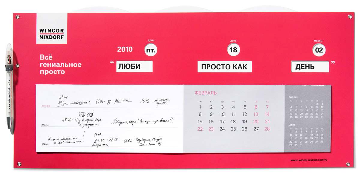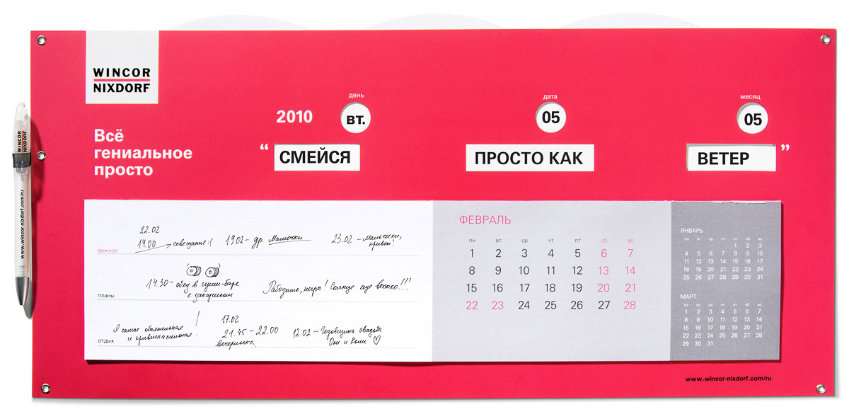 Простой календарь от компании Wincor Nixdorf и Студии DEZAКонструкция календаря предельно проста: жесткая основа и отрывной календарный блок. Приятным дополнением к конструкции является механизм для выставления текущей даты - дня недели, числа и месяца. "Ежедневно, производя эту сугубо практическую операцию, мы получаем "Девиз дня", а вместе с ним заряд бодрости и хорошего настроения. Каждый день - новый девиз, и так целый год. Объединяет их все одно слово - "просто". "Лети просто как ветер", "Люби просто как солнце", "Танцуй просто как волна"..., - рассказывают дизайнеры. - Действительно, радоваться, быть довольным и в конечном итоге счастливым просто, если ты сам к этому стремишься".Численник календаря совмещен с мини-планировщиком - события текущего месяца можно распланировать по датам и разложить по полочкам: "важное", "планы" и ни в коем случае не забыть про "отдых". Ручка для записей всегда под рукой. Состав творческой группы Идея: Данил Ярцев Дизайнеры: Михаил Дымов, Анастасия Жуковская |