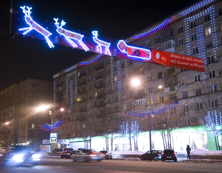 В поддержку новогоднего предложения МОБИЛЬНОГО ОПЕРАТОРА МТС -- "МТС Коннект по суперцене" -- Московская Городская Реклама по заказу агентства Master Ad изготовила и по заказу агентства Максима разместила 5 нестандартных перетяжек с использованием световых элементов. На перетяжке размещены выносные элементы в виде USB-модемов, имитирующих оленей. Все экстендеры по периметру обрамлены белой диодной подсветкой. Размещение проходит в период с 21 по 31 декабре в центре столицы.