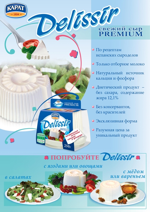 "Карат" выпускает новый сыр - DelissirВ канун нового года на Московском заводе плавленых сыров "Карат" начался выпуск нового продукта - свежего сыра Delissir.Сыр производится из натурального молока и относится к категории свежих сыров. Европейское и российское оборудование стоимостью более 3 млн. евро и мощностью до 5 тыс. тонн в год поставлено в рамках совместной инновационной программы Правительства Москвы и ЗАО "Карат". Состав творческой группы Директор по маркетингу: Образцова С.В. Бренд-менеджер: Саникович М.А. Главный художник: Шульгина Е.Е. |