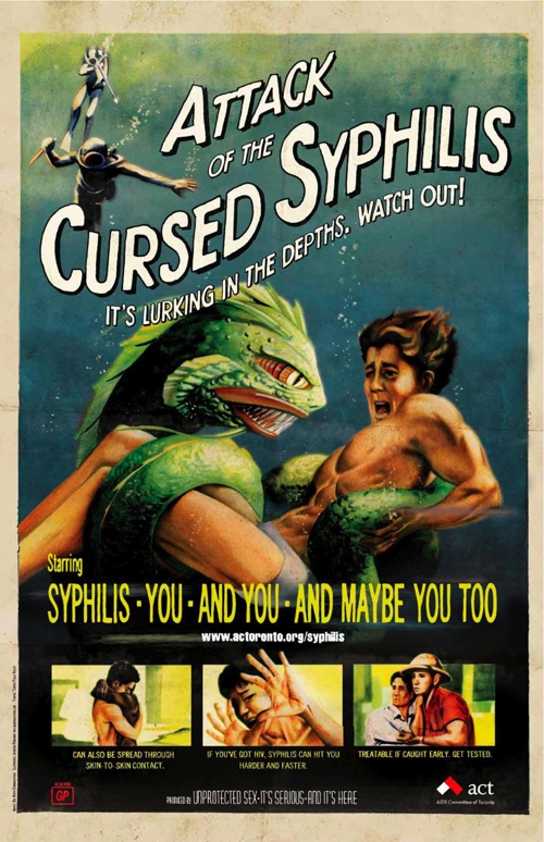 Сифилис - морское чудовищеСоциальная кампания Комитета по СПИДу ТоронтоКомитет по СПИДу Торонто или ACT запустил новую печатную кампанию против венерических заболеваний, в частности - против сифилиса. Канадское агентство Due North Communications решило пойти ровно тем же путем, что и немецкое Serviceplan в недавней кампании, промотирующей программу ООН по окружающей среде. Принт также выполнен в стиле ретро-киноафиши для фильма ужасов: "Атака проклятого Сифилиса. Оно скрывается в глубине. Берегись! В ролях: Сифилис - Ты - И ты - И может быть ты". Состав творческой группы Agency: Due North Communications, Toronto, Canada Creative Director: Karen Howe Art Director: Yilma Campbell Copywriter: Sarah Watton Illustrator: Rick Jacobson |