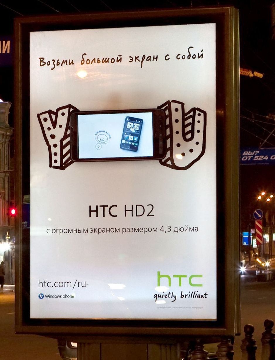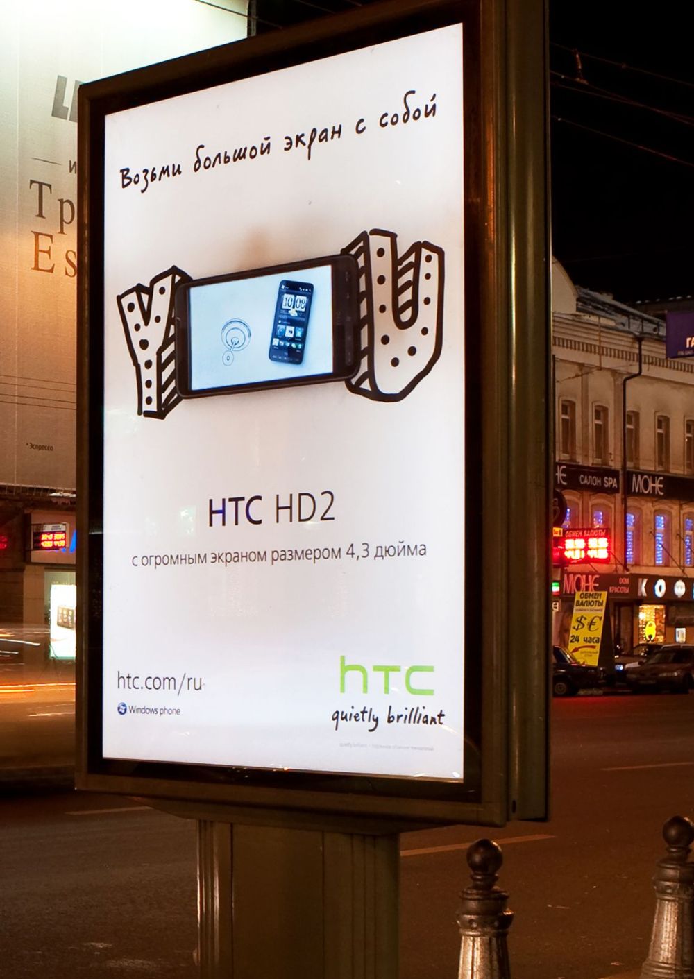 В кампании задействованы нестандартные поверхности сити-формата под названием "Картридж", предназначенные для наполнения их внутреннего объема рекламной продукцией как в натуральную величину, так и имитацией. Для продвижения HTC HD2 внутрь конструкций был вмонтирован монитор, беспрерывно транслирующий ролик о преимуществах нового коммуникатора. Питание экрана осуществляется за счет аккумулятора, встроенного в ногу установки. Уникальное размещение реализовано на 10 конструкциях, установленных в центре Москвы.