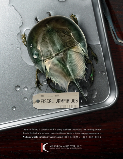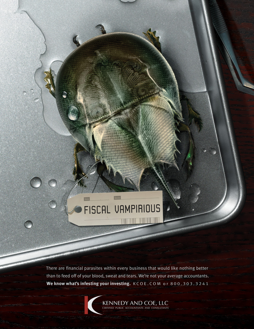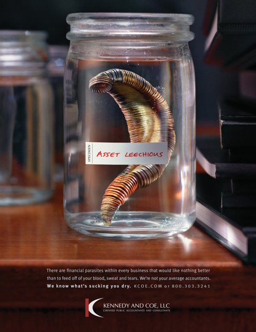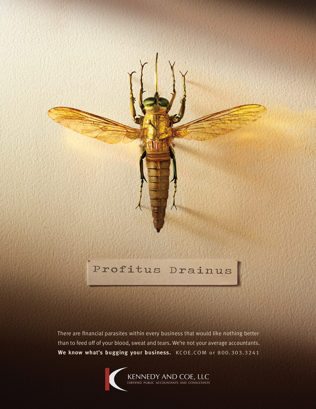 Kennedy&Coe избавит от финансовых паразитовРеклама американской бухгалтерской и консалтинговой компанииАгентство Associated Advertising разработало интересную компанию для одной из крупнейших компаний, оказывающей бухгалтерские и консалтинговые услуги в США. Чтобы продемонстрировать, насколько полезны услуги Kennedy&Coe для бизнеса, креативщики придумали особых финансовых паразитов, которые способны пустить на дно любое успешное предприятие. Kennedy&Coe, в свою очередь, представлены теми, кто без труда избавит от этих жутких тварей. ASSET LEECHIOUS (АКТИВУС ПИЯВКУС) Есть финансовые паразиты внутри каждого бизнеса, для которых нет ничего лучше, чем высасывать вашу кровь, пот и слезы. Мы не ваши обычные бухгалтеры. Мы знаем, что высасывает вас досуха. FISCAL VAMPIRIOUS (НАЛОГУС ВАМПИРУС) Есть финансовые паразиты внутри каждого бизнеса для которых нет ничего лучше, чем высасывать вашу кровь, пот и слезы. Мы не ваши обычные бухгалтеры. Мы знаем, что заражает ваши инвестиции. PROFITUS DRAINUS (ДОХОДУС УТЕЧКУС) Есть финансовые паразиты внутри каждого бизнеса, которые хотели бы ничего лучше, чем подпитывают вашу кровь, пот и слезы. Мы не ваши обычные бухгалтеры. Мы знаем, что мешает вашему бизнесу. Состав творческой группы Advertising Agency: Associated Advertising, USA Creative Director / Copywriter: Jerry Stoner Art Director: Ian Johnson |