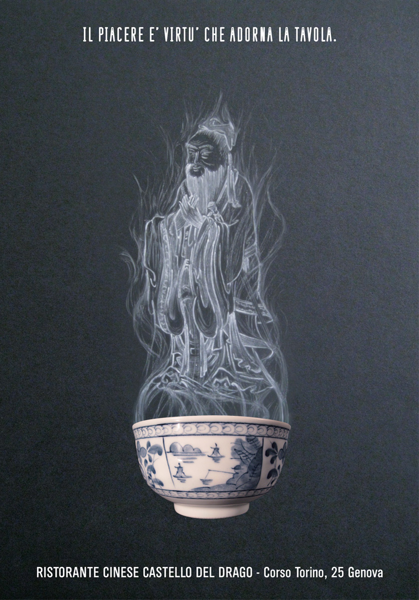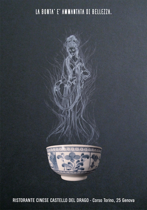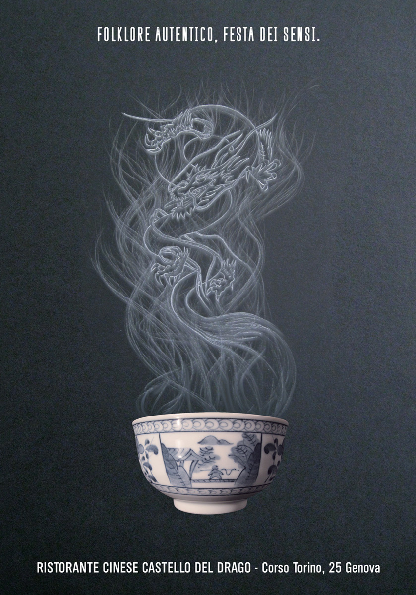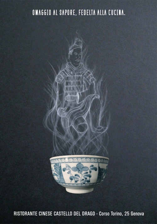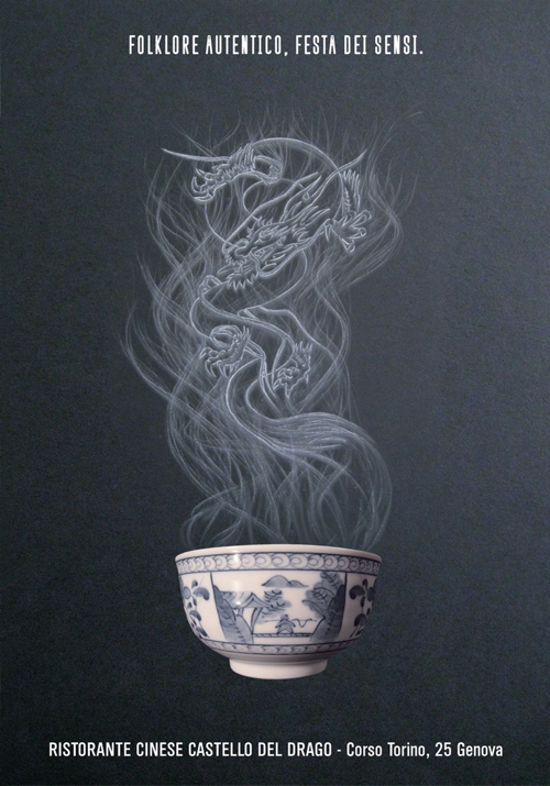Миланское агентство Alch1m1a ADV разработало серию принтов для рекламы итальянского китайского ресторана Castello del Drago, что значит "Замок Даркона". В оформлении принтов использован классическая тематика Востока и своеобразный метод изображения. Копирайт отличается краткостью с претензией на восточную мудрость.