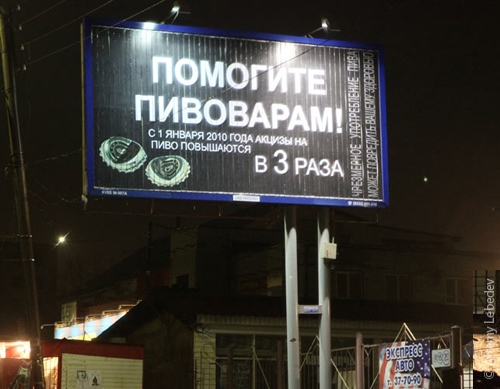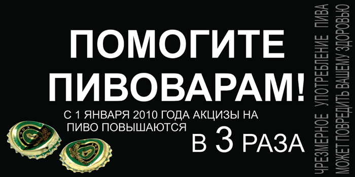 В Кирове завершилась рекламная кампания, поддерживающая пивоваровМакеты предлагали пить больше пиваПеред Новым годом в Кирове завершилась рекламная кампания «Помогите пивоварам», размещавшаяся на городских билбордах. Ее заказчиков выступил пивоваренный завод «Вятич», выпускающий продукцию под одноименной маркой, а также «Жигулевское» пиво. Рекламные макеты, выполненные в трагически-черном дизайне, призывали горожан поддержать пивную промышленность. Текст на билборде напоминал, что с 1 января 2010 года акцизы на пиво повышаются в три раза.