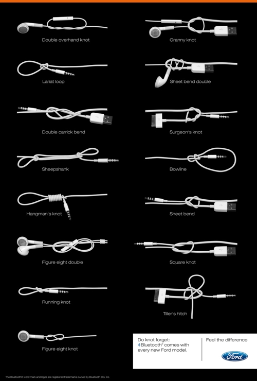 Ford вяжет морские узлы из проводовКампания напоминает водителям о BluetoothOgilvy Brand Center из Дюссельдорфа разработал необычную кампанию для автоконцерна - рекламируются не автомобили Ford, а технология Bluetooth. На принте представлены основные морские узлы, сделанные не из веревок, а из проводов и наушников. Кампания проходит под девизом "Не забывайте: Bluetooth поставляется с каждой новой моделью Ford" Состав творческой группы Advertising Agency: Ogilvy Brand Center, D?sseldorf, Germany Creative Director: Bernd Grellmann Art Director: Lars Ecker Copywriter: Miriam Ravagni Photographer: Lars Ecker Client Service Director: Sven A. Crone |