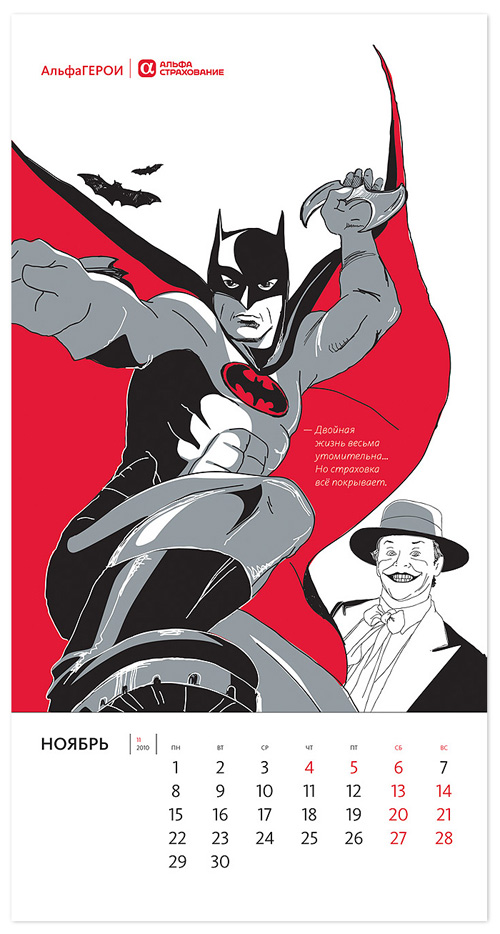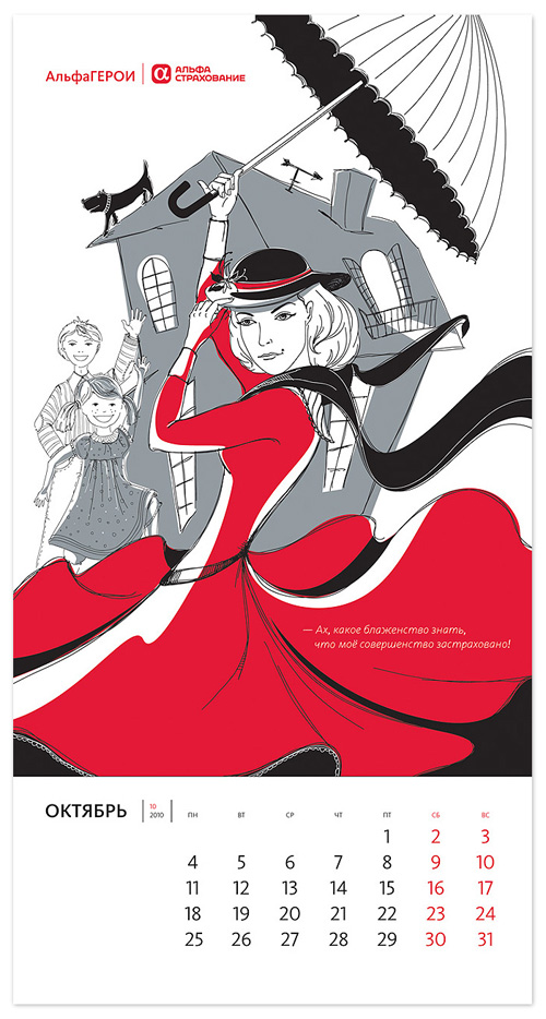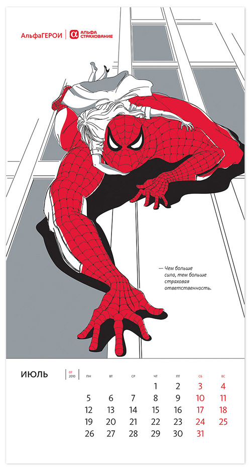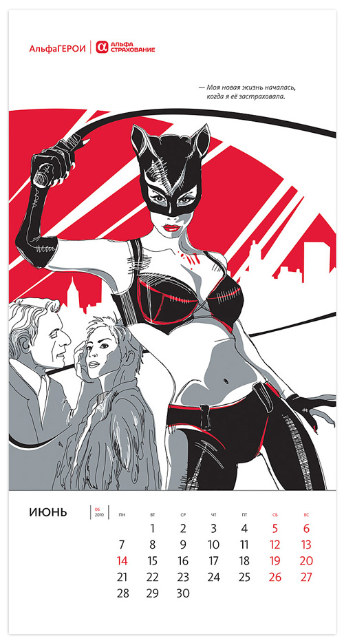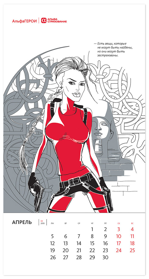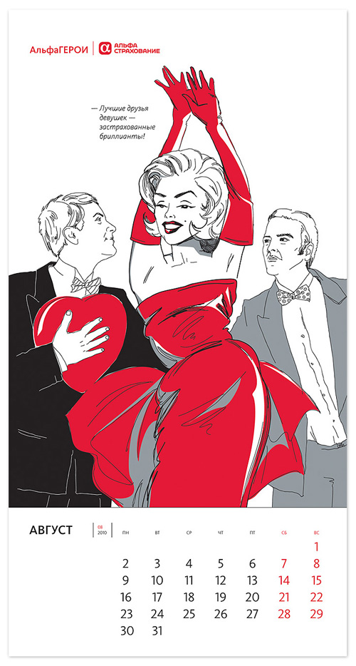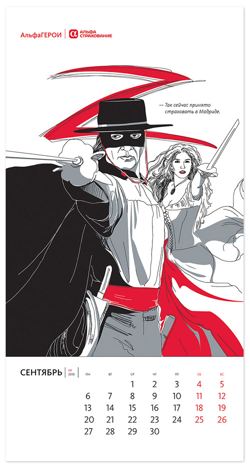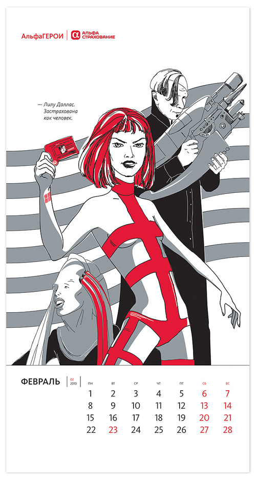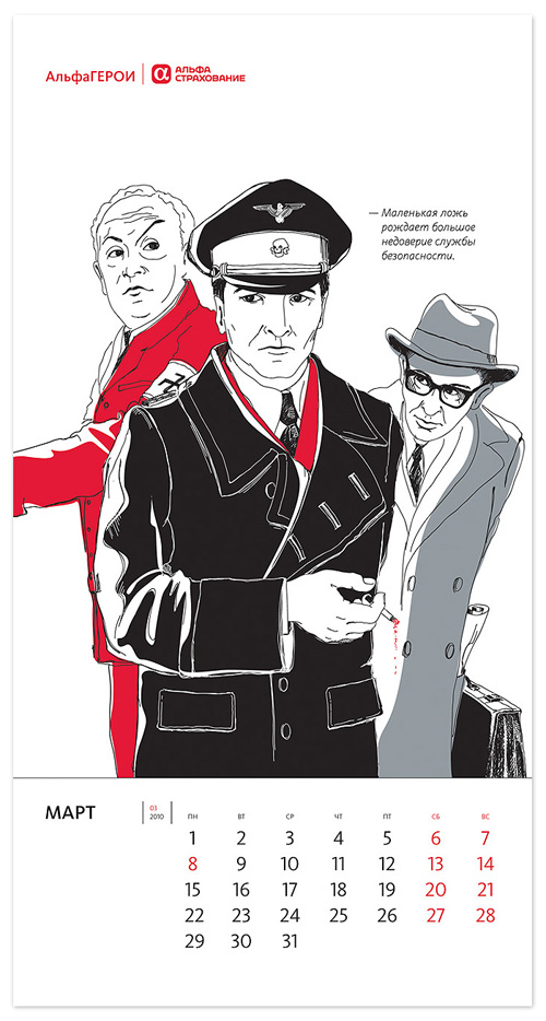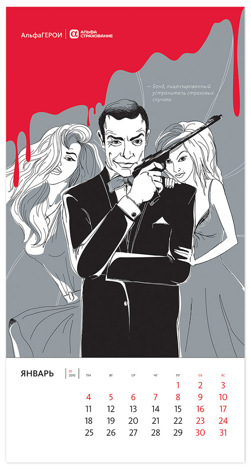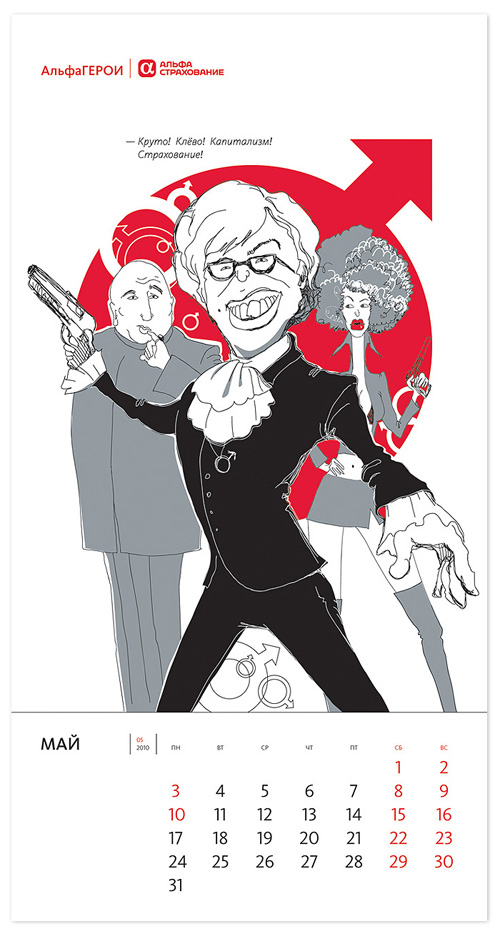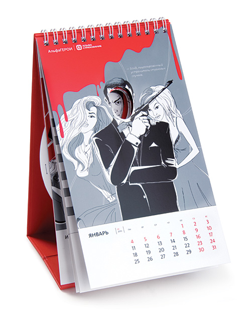 Героический календарь от компании "АльфаСтрахование" и Студии DEZA"В наступающем году компания "АльфаСтрахование" и Студия DEZA решили порадовать коллег и партнеров компании юмористическим календарем с элементами интерактива.На 12 листах календаря собрана команда настоящих героев, АльфаГЕРОЕВ. Каждый из представленных персонажей является воплощением силы, красоты, бесстрашия, увлекательной жизни, полной адреналина, каждый - объект восхищения и повод для зависти. Стать АльфаГЕРОЕМ предельно просто - несколько ваших фотографий и фотографий ваших коллег плюс острые ножницы мгновенно вдохнут реальную жизнь в эти заманчивые образы. Добро пожаловать в команду АльфаГЕРОЕВ! В конструкции календаря предусмотрена вырубка каждого листа. Лица персонажей и места для вклеивания фотографий нанесены на отдельный вращающийся круг. Вращая "колесо", можно с легкостью "приставить" голову одного персонажа к другому или, что еще более увлекательно, свою фотографию или фото ближнего своего, благо в любой компании со всевозможных корпоративов накоплен изрядный фотоархив. Подобный нехитрый прием позволит каждому создать календарь буквально со своим собственным неповторим лицом и лицами любимых коллег, который скрасит шуткой и улыбкой ни один рабочий день. Календарь выполнен в настенном и настольном вариантах. Творческая группа: Креативный директор: Александр Суворов Дизайнеры: Ирина Шмидт, Нина Клеопина