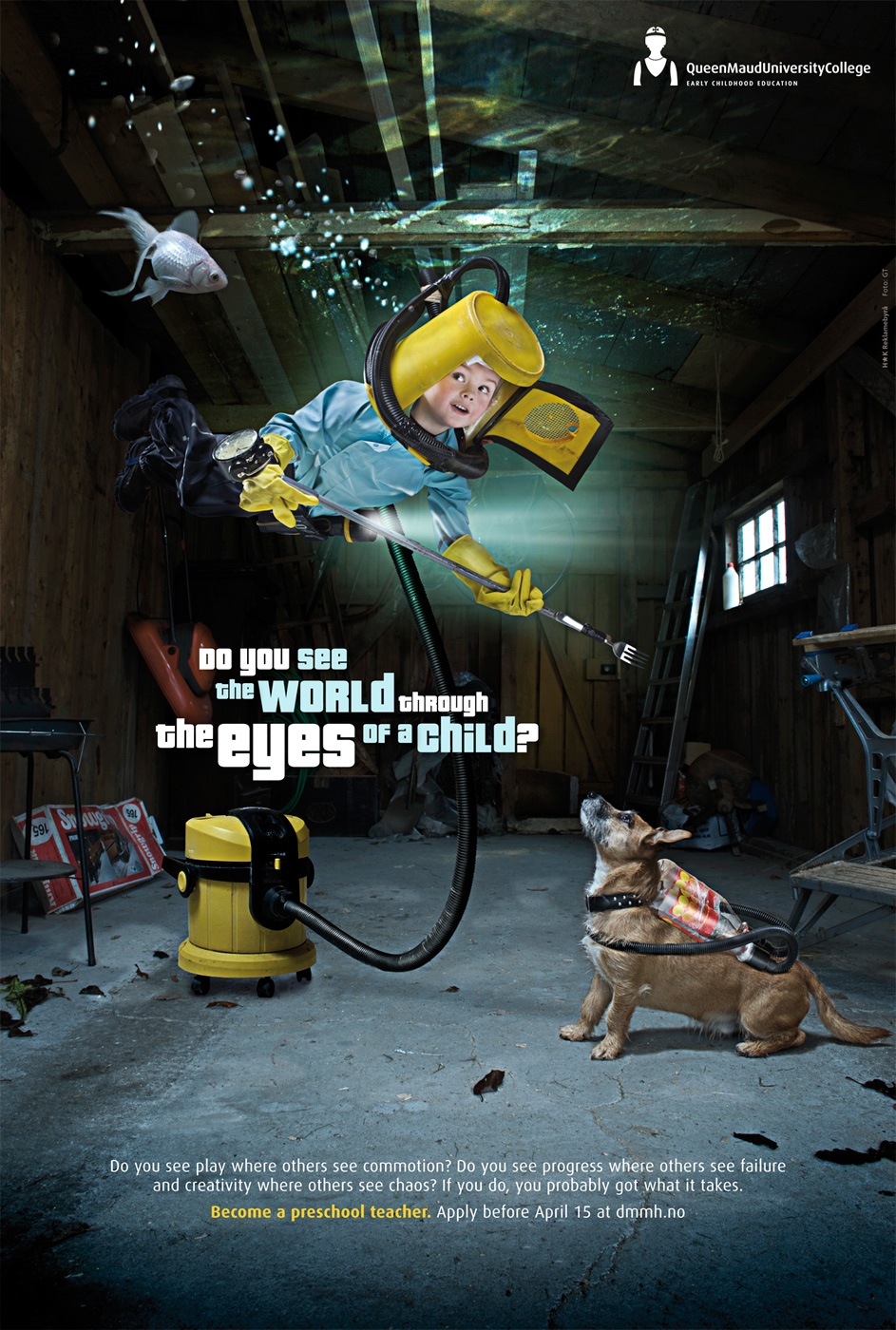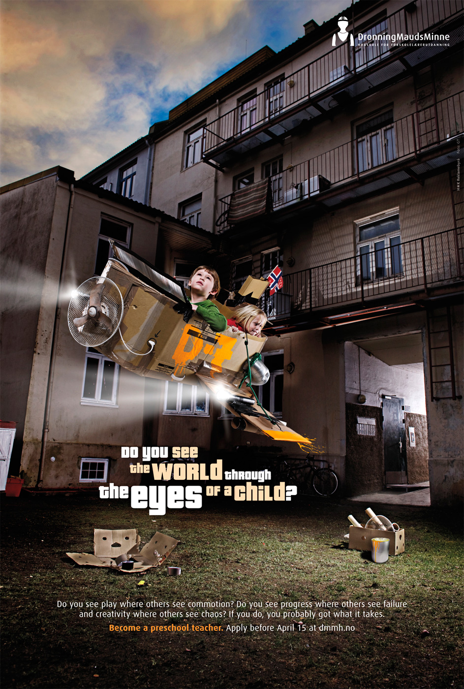 Норвегия вербует не в солдаты, а в учителяРеклама норвежского учебного заведения Queen Maud's CollegeАгентство HK Advetising разработало печатную кампанию для норвежского Колледжа дошкольного образования Королевы Мод, который успешно работает с 1947 года. Основная деятельность этого учебного заведения состоит в том, чтобы подготовить профессионалов в сфере дошкольного образования. Кампания, по сути, является вербовочной и выполнена по всем законом данного стиля, используя вопросы и призыв: Ты видишь мир глазами ребенка? Ты видишь игру там, где другие видят беспорядок? Ты видишь прогресса там, где другие видят провал и творчество - там, где другие видят хаос? Если да, то ты, вероятно, имеешь то, что нужно. Стань дошкольным учителем. Подай заявление до 15 апреля на сайте dmmh.no Состав творческой группы Advertising Agency: HK Advetising Agency, Trondheim, Norway Creative Director / Art Director: Frank Trana Copywriter: Hanne Thoresen Photographer: GT Nergaard |