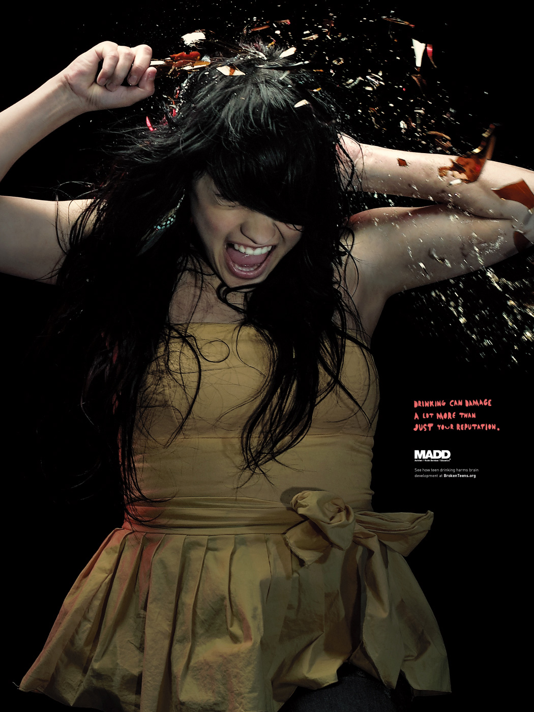 Бутылкой по головеПродвижение антиалкогольного проекта организации Mothers Against Drunk DrivingАмериканская общественная организация Mothers Against Drunk Driving занимается в первую очередь такой проблемой как вождение в нетрезвом виде. Кроме того, деятельность MADD направлена на работу с молодежью с целью профилактики употребления алкоголя несовершеннолетними. Агентство Esparza Advertising, Albuquerque создало кампанию, в которой сравнило выпивку с ударом бутылкой по голове. Девиз кампании "Подростковое пьянство наносит ущерб мозгу", помимо принтов создан также минисайт Brokenteens.org, на котором эти принты уже приходят в движение.