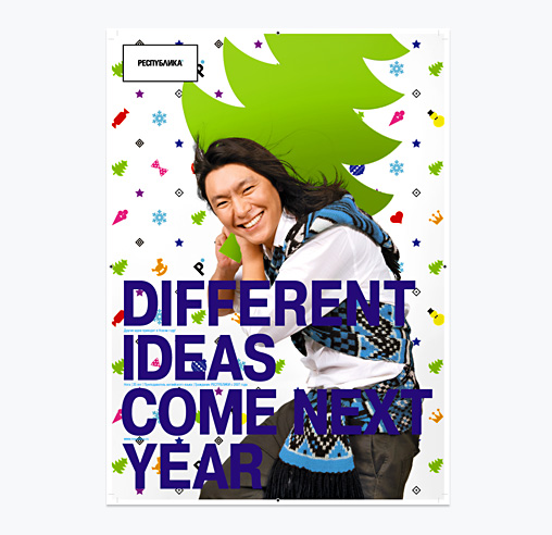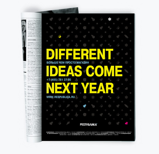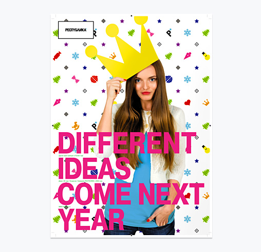 Чтобы напомнить своей аудитории о себе в канун самого праздного времени – всеобщих новогодних каникул – «Республика» придумала особую концепцию празднования. Эта кампания включила в себя новогоднюю айдентику, постеры, изображающие счастливых людей, похожих на постоянных покупателей, и слоган, обещающий в будущем году еще больше хороших и разных идей. Вся графика кампании сделана в Graphic Productions: