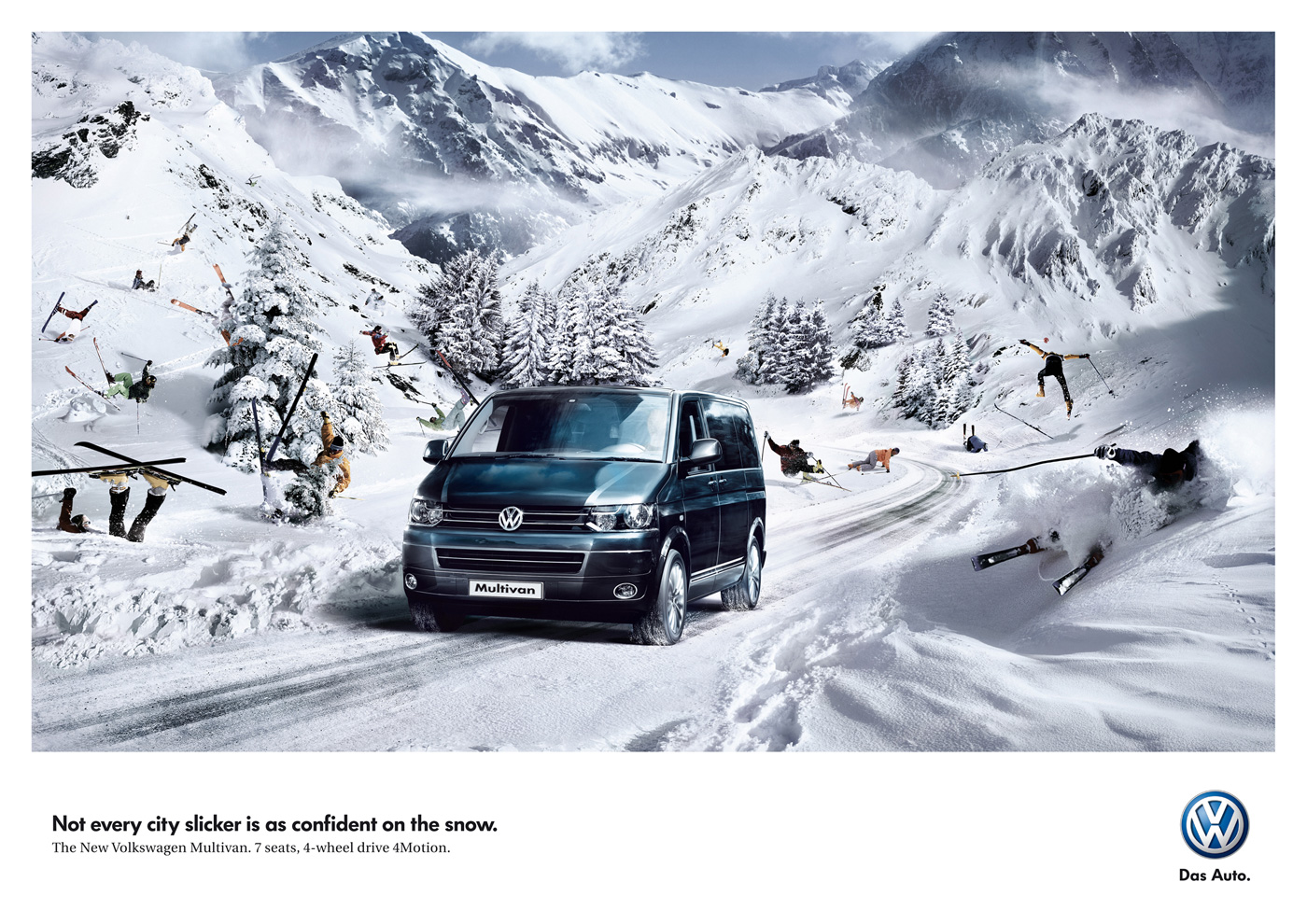 Volkswagen'у лыжники по бокуРеклама нового Volkswagen Multivan от миланского DDBDDB Milan, которое уже работало с кампанией для подержанных автомобилей Volkswagen, теперь рекламирует новую модель Volkswagen Multivan. Возможно, этой рекламе и не достает утонченной образности, как это было у бразильского AlmapBBDO с горным бараном, однако создатели также подошли к делу с юмором, пусть и немного грубоватым: Не каждый городской хлыщ так же уверенно стоит на снегу.