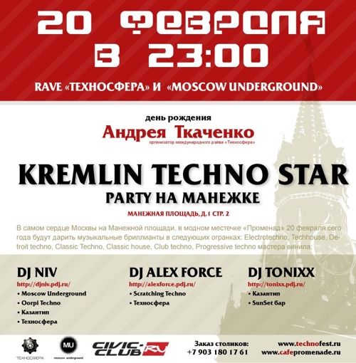 PR2B Group работает на КремльСтарт кампании Kremlin Techno StarПиар и брендинговое агентство PR2B Group обеспечило брендинговую, креативную и рекламно-информационную поддержку Kremlin Techno Star party. Kremlin Techno Star - новый, "домашний" формат рейв-фестивалей "Техносфера" и "Moscow Undeground". Миссия Kremlin Techno Star - обеспечить "атмосферу рейв-дома" для людей, увлечённых электронной музыкой, предоставить постоянную возможность ощущать себя частью техно-культуры. Kremlin Techno Star собирает лучших диджеев и наиболее прогрессивные музыкальные группы. Первый из "домашних" концертов, посвященный дню рождения Алексея Ткаченко, организатора рейва "Техносфера", состоится 20 февраля в 23.00 в известном московском клубе "Променад". Среди участников Kremlin Techno Star: NIV, ALEX FORCE, TONIXX… Среди работ, выполненных специалистами PR2B Group для Kremlin Techno Star - бренд-консалтинг, креативное содействие в построении концепции мероприятия, разработка рекламной стратегии, проведение рекламных кампаний на транспарант-перетяжках, афишах сити-формата и интернет-баннерах, разработка и проведение PR-кампании, включая блоггинг, элементы "вирусного маркетинга" и социальные сети, коррекция системы информационного сопровождения. Проектом руководит креативный продюссер PR2B Group Федор Брандоусов. Необходимо отметить, что PR2B Group считает свое участие в культурных проектах элементом своей корпоративной социальной ответственности. |