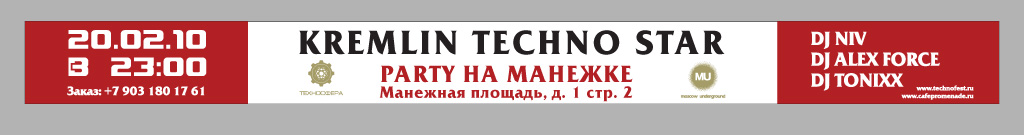 PR2B Group работает на КремльСтарт кампании Kremlin Techno StarПиар и брендинговое агентство PR2B Group обеспечило брендинговую, креативную и рекламно-информационную поддержку Kremlin Techno Star party. Kremlin Techno Star - новый, "домашний" формат рейв-фестивалей "Техносфера" и "Moscow Undeground". Миссия Kremlin Techno Star - обеспечить "атмосферу рейв-дома" для людей, увлечённых электронной музыкой, предоставить постоянную возможность ощущать себя частью техно-культуры. Kremlin Techno Star собирает лучших диджеев и наиболее прогрессивные музыкальные группы. Первый из "домашних" концертов, посвященный дню рождения Алексея Ткаченко, организатора рейва "Техносфера", состоится 20 февраля в 23.00 в известном московском клубе "Променад". Среди участников Kremlin Techno Star: NIV, ALEX FORCE, TONIXX… Среди работ, выполненных специалистами PR2B Group для Kremlin Techno Star - бренд-консалтинг, креативное содействие в построении концепции мероприятия, разработка рекламной стратегии, проведение рекламных кампаний на транспарант-перетяжках, афишах сити-формата и интернет-баннерах, разработка и проведение PR-кампании, включая блоггинг, элементы "вирусного маркетинга" и социальные сети, коррекция системы информационного сопровождения. Проектом руководит креативный продюссер PR2B Group Федор Брандоусов. Необходимо отметить, что PR2B Group считает свое участие в культурных проектах элементом своей корпоративной социальной ответственности. |