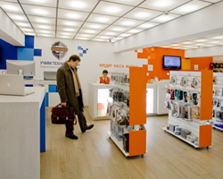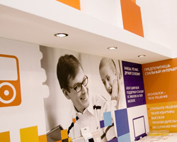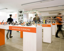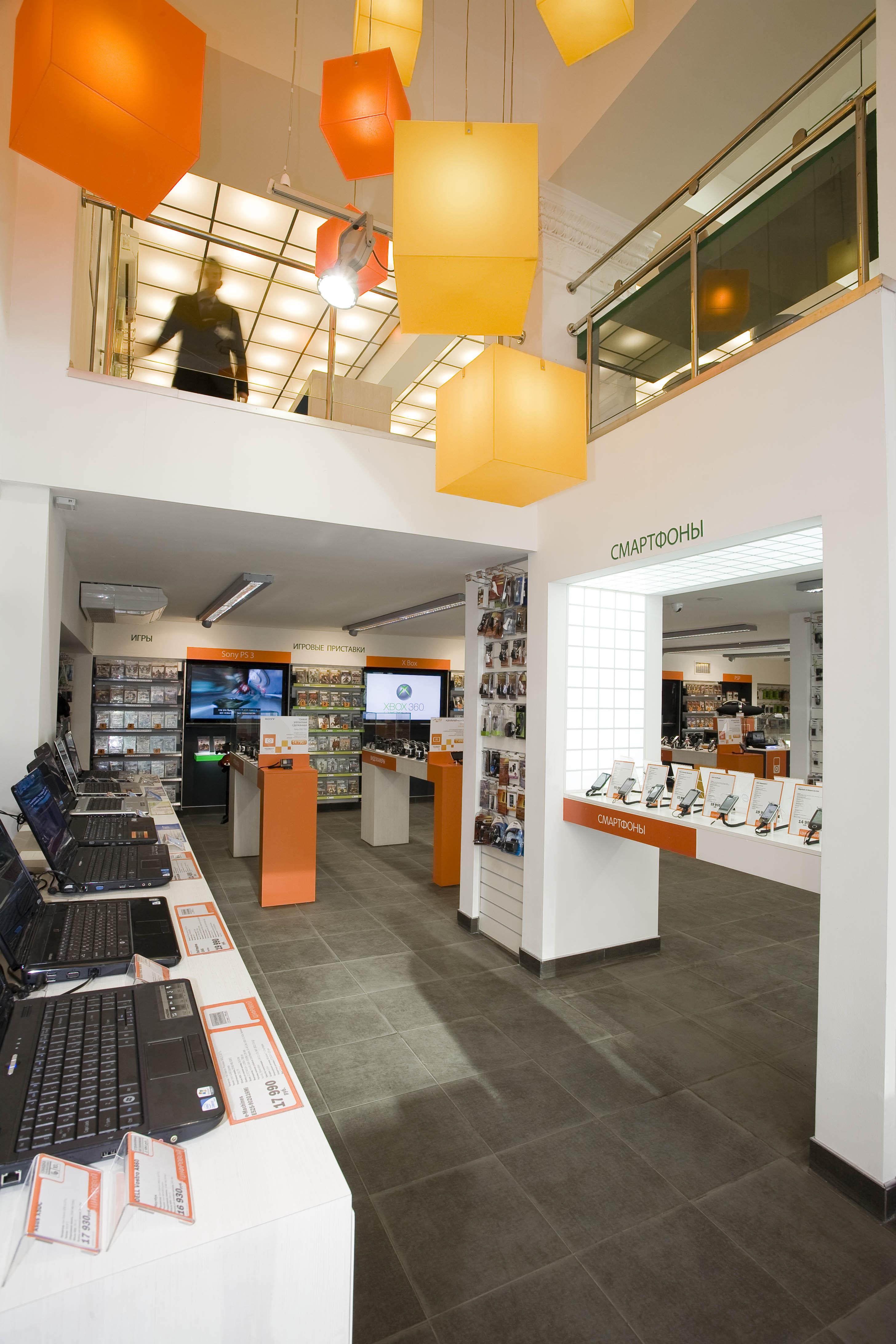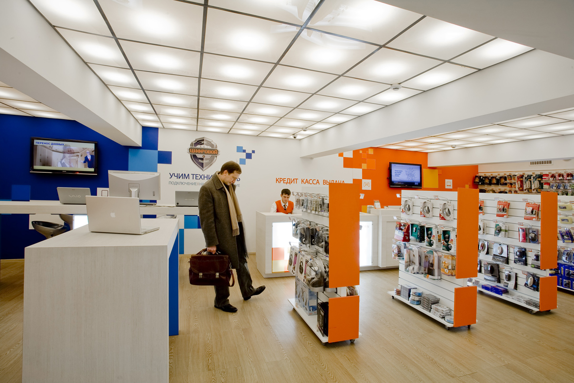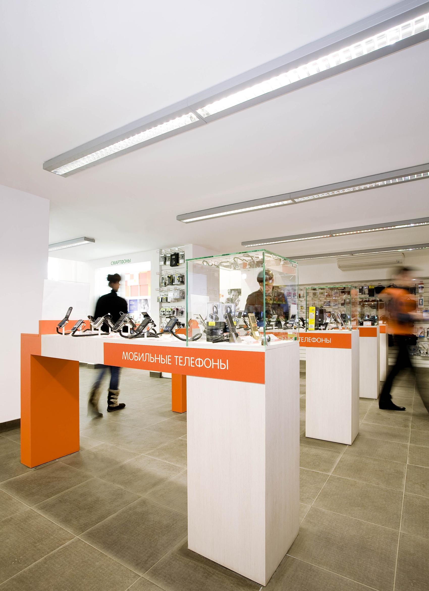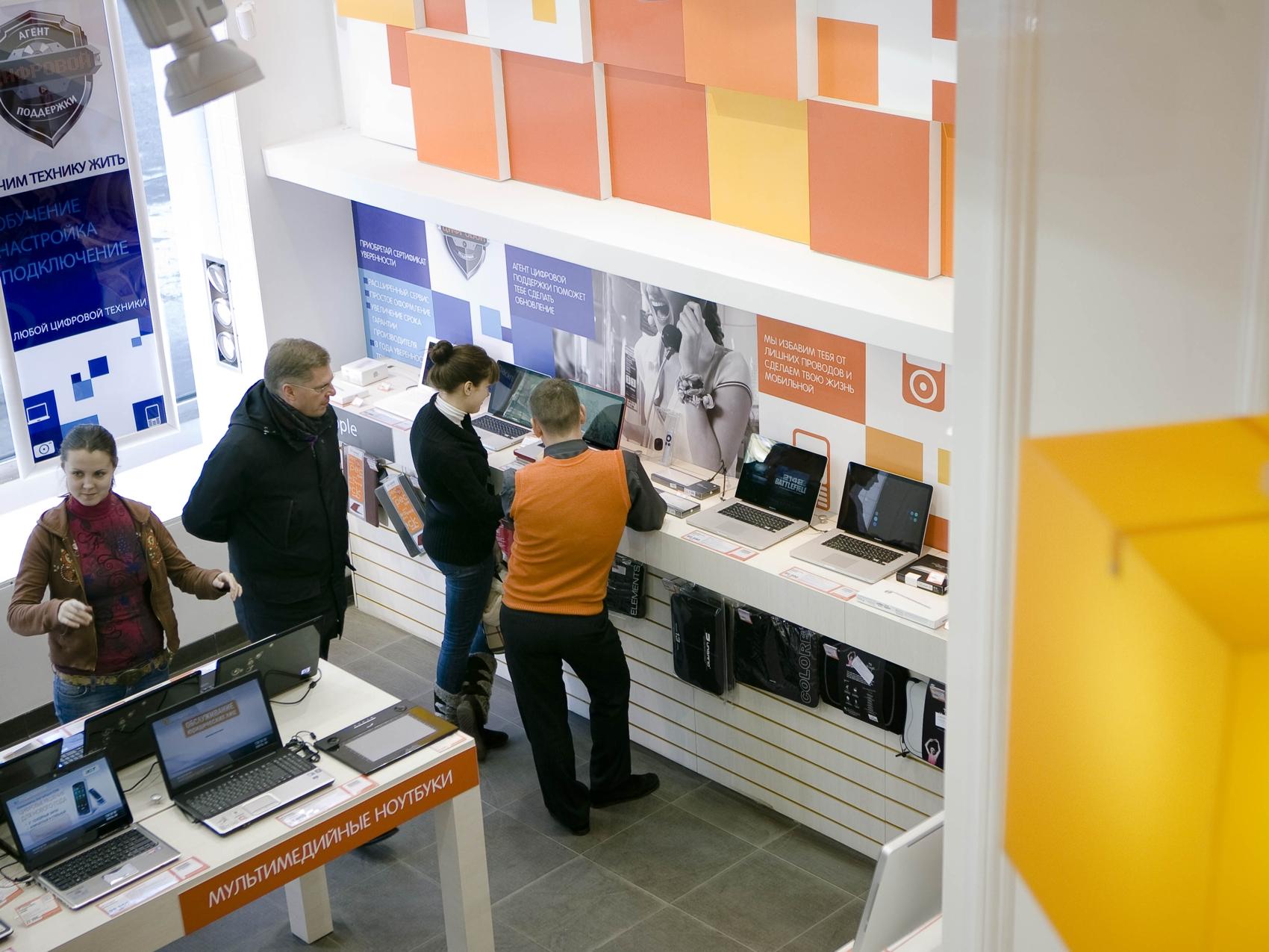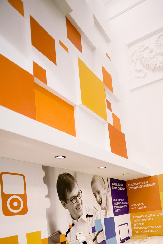 "Путь покупателя", система зонирования и навигации формируют циркуляцию потока посетителей внутри магазина, помогают потребителям быстро найти нужный им товар или услугу и ознакомиться с полным спектром товарного предложения, включая сопутствующие товары, что способствует продвижению кросс-продаж. Эффективное использование пространства достигается благодаря оригинальным решениям, таким как расположение витрин со смартфонами между структурными колоннами. Коммуникации бренда с потребителями способствует настенная графика, информирующая о привлекательных услугах, например, сервис "Агент ЦИФРОВОЙ поддержки". Расположенная на втором этаже Интернет-зона позволяет посетителям отдохнуть и занять себя во время ожидания, когда, например, технику им настраивают профессиональные консультанты.