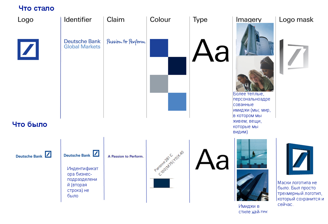 Новый бренд и визуальный образ "Дойче Банка"Deutsche Bank выводит свой бренд и визуальный образ на новый уровень, тем самым подчеркивая устойчивость банка в период выхода из кризиса.Имидж Дойче Банка, представляемый через бренд и визуальный образ, – один из самых сильных в мире. Намерение Банка пойти дальше демонстрирует его решимость занять почетное место в группе избранных глобальных субербрендов. Дмитрий Агишев, руководитель Департамента связей с общественностью, корпоративных отношений и маркетинга Дойче Банка в России: «Новый бренд и визуальный образ Банка, введенные в текущем месяце по всему миру, нацелены на то, чтобы представить Дойче Банк проактивным лидером как в бизнесе, так и в иных сферах деятельности. Введя в действие новую концепцию корпоративного дизайна, Дойче Банк предстанет глобальным игроком, уверенно реализующим подход к управлению брендом с целью соответствовать требованиям современной информационной среды, где нужны четкие, лаконичные, лишенные какой-либо двусмысленности символы. Новая система рекомендаций по созданию идентичности бренда и визуального образа, вводимая во всех подразделениях Дойче Банка и во всех регионах станет отражением единого бренда для единого банка». Что изменится? Пересмотрены особенности, определяющие идентичность бреда: миссия, характер и обещание. Основные элементы брэнда, подвергнутые изменению: Логотип (квадрат с помещенной в него диагональю). Станет самостоятельным. В рамках нового имиджа банка лаконичный логотип Дойче Банка (квадрат с помещенной в него диагональю), являющийся символом роста в обстановке стабильности, станет самостоятельным, и, как и логотипы всех великих брендов, будет говорить сам за себя. Этот шаг закрепит за Дойче Банком статус банка, устанавливающего отраслевые стандарты, и продемонстрирует его уверенную стабильность. Девиз Банка («Стремление к совершенству»). Будет представлен в рукописной надписи. Существенно преобразится и форма подачи девиза Банка - «Стремление к совершенству». Представленный в рукописной надписи, девиз будет размещен под ключевыми обращениями с целью продемонстрировать личную заинтересованность и вдохновение, символизируемые девизом. Более индивидуальный характер бренда. Философия «одного банка» будет подкрепляться подчеркнутой индивидуальностью бренда, определяющей уникальные качества Дойче Банка: энтузиазм, точность, уверенность и гибкость мышления. Визуальный стиль Кроме того, единый визуальный стиль обеспечит системность, столь характерную для всех великих брендов. Цветовая палитра Введен более глубокий синий пантон Дойче Банка, а также новые дополнительные цвета. Шрифты Более структурированный и точный подход к шрифтовому оформлению. Образный ряд Образный ряд станет более динамичным и персонально-ориентированным Трехмерный логотип Вводится новый граничный трехмерный логотип Новые маркетинговые материалы, которые появятся в связи с обновлением бренда. К конце февраля 2010 г. будет перезапущен бренд-портал и выпущены новый брэнд-бук и рекомендации по созданию визуального образа Дойче Банка. Изменится дизайн рекламы, всех интернет-порталов Банка, видеофильмов о его деятельности, в рекомендации по их созданию будут также внесены соответствующие изменения. Постепенно будут ликвидированы все существ