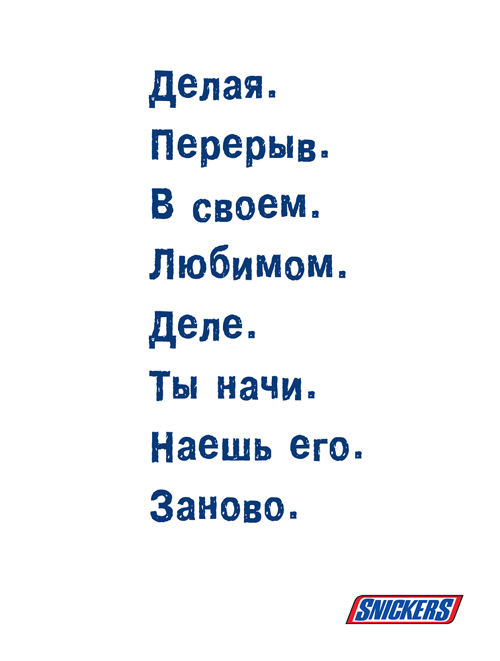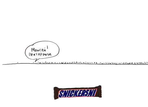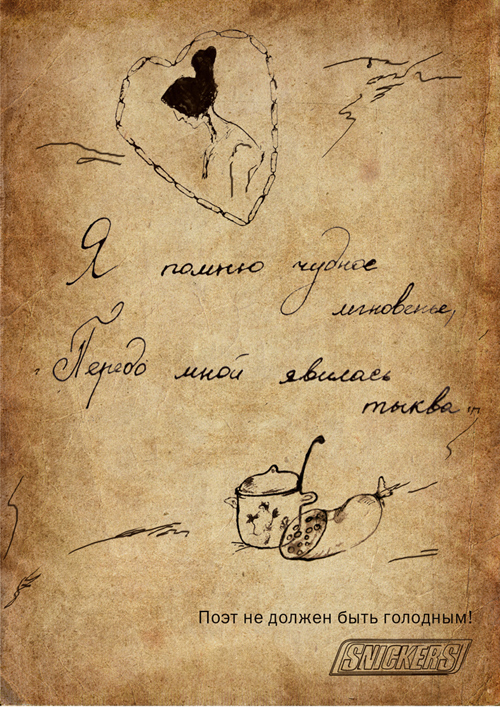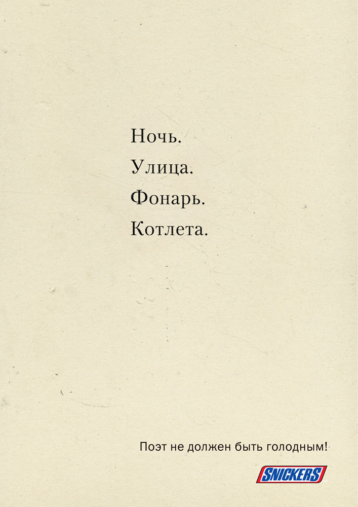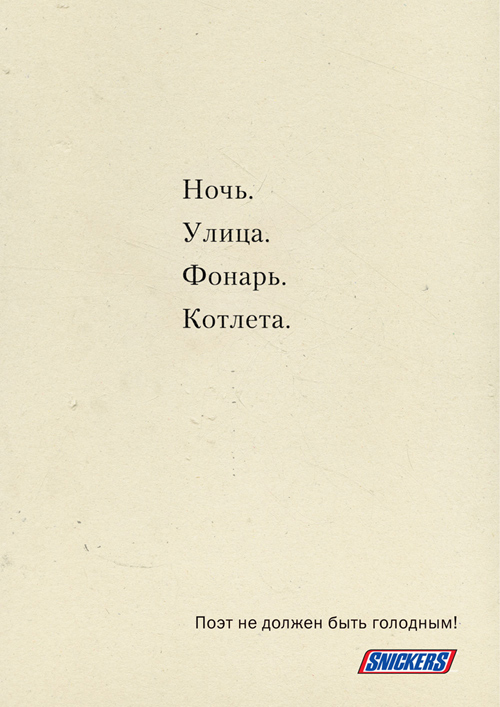 "Не тормози - Сникерсни" глазами WordshopУчебные работы Академии коммуникаций для SniсkersОдним из учебных заданий Лени Фейгина на факультете арт-дирекшна Академии Коммуникаций было погружение в мир бренда. На основе своего представления о коммуникации бренда Snickers нужно было создать серию принтов. Представляем вашему вниманию лучшие работы. Автор: Костя Пальянов, арт-директор "Кто-то из копирайтеров мне подсказал, что было бы интересно отобразить процесс движения с остановкой. Притормози, мол, - рассказывает Константин Пальянов. - Так родилась идея про Моисея, что со Snickers он, допустим, мог бы дойти за 2 дня. Я решил сделать простой скетч, т.к. не было технических средств и времени. К тому же, чем меньше визуального мусора, говорит Фейгин, тем быстрее считывается и запоминается идея". Авторы: Касимова Рита - копирайтер, Кузнецова Катя - арт-директор Комментарий: Инсайт - если голод постоянно тебя прерывает, невозможно ничего доделать до конца. Идея - визуализируем инсайт с помощью то и дело прерывающегося текста. Авторы: Касимова Рита - копирайтер, Кузнецова Катя - арт-директор Комментарий: Инсайт - если ты голоден, еда вмешивается в твое любимое дело и, разумеется, все портит. Идея - показываем, как выглядели бы известные нам стихотворения, если бы поэты в момент их написания думали о еде, а не об искусстве. |