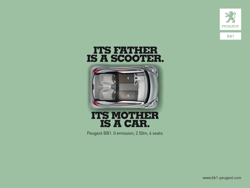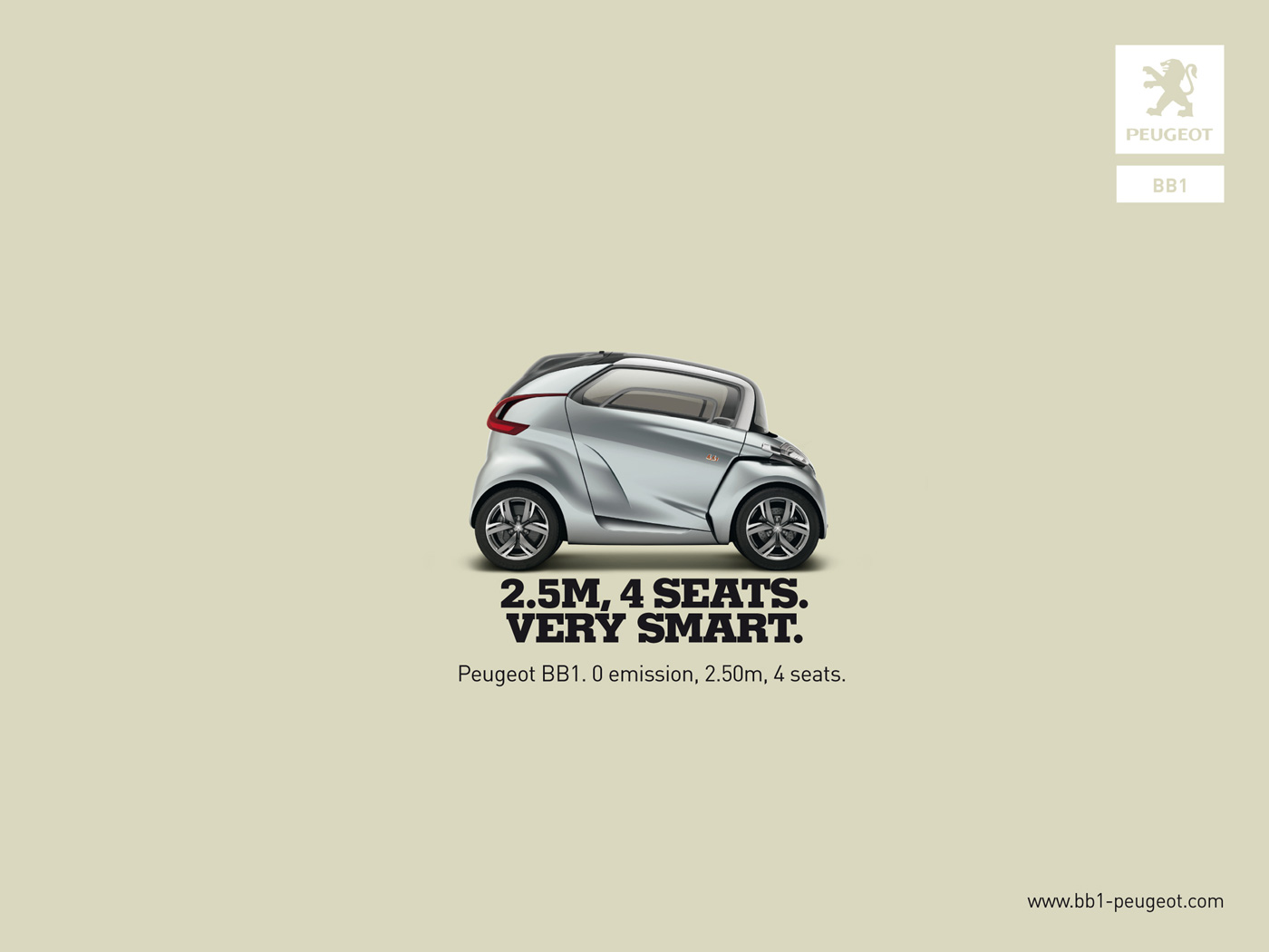Peugeot BB1 - дитя скутера и машиныРеклама нового компактного автомобиля маркиBETC Euro RSCG Paris разработало кампанию для новой модели Peugeot BB1, который отличается своей компактностью и экологичностью. Реклама обходится без визуальных излишеств - просто показан автомобиль и парой фраз подчеркнуты какие-то из его достоинств. 2,5 метра, 4 сиденья. Очень умно.