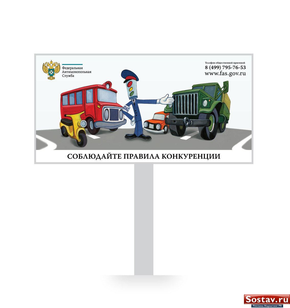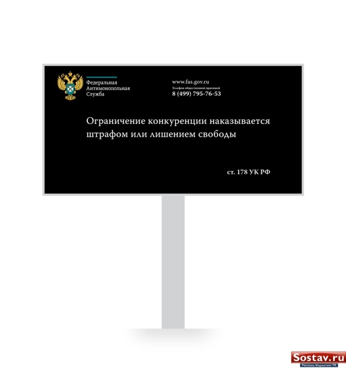 ФАС России понадобилась рекламаВ феврале стартовала кампания в поддержку антимонопольной службыГлавным образом в ФАС хотят обратить внимание общественности, в том числе представителей бизнеса и власти, на необходимость соблюдения антимонопольного законодательства и создание условий для развития конкуренции. Так прокомментировали Sostav.ru эту акцию в ведомстве. Как известно, в 2009 году вступил в силу так называемый "второй антимонопольный пакет законов", предусматривающий, кроме прочего, уголовную ответственность до 7 лет лишения свободы за нарушение антимонопольного законодательства за сговор и неоднократное злоупотребление доминирующим положением на рынке (статья 178 Уголовного Кодекса Российской Федерации). В свою очередь для чиновников предусмотрена такая мера наказания, как дисквалификация, другими словами - лишение права замещать должность госслужбы или муниципальной службы на срок до 3 лет. Это своего рода предупреждение: "Подумайте, прежде чем нарушить закон!". Об этом представители ФАС сообщили Sostav.ru. Кроме того в антимонопольной службе хотят ещё раз подчеркнуть, что необходимо соблюдать правила конкуренции. И это распространяется на все компании независимо от их размера, объема и веса. Как отмечают в ведомстве, честная конкуренция - залог успеха для бизнеса и эффективного развития для экономики в целом. ФАС следит за тем, чтобы правила конкуренции соблюдались, "большие" необоснованно не давили "маленьких", отметила пресс-секретарь ведомства Ирина Кошулина. Для обозначенных целей по Москве размещено 100 щитов размером 3х6 метров. Аналогичная рекламная кампания проводится или еще будет проводиться некоторыми территориальными органами ФАС России. Шамиль Юсупов, Sostav.ru |