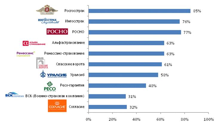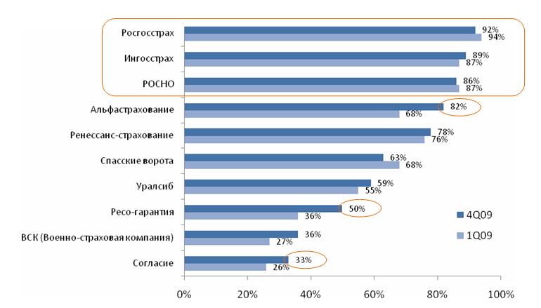 Самый узнаваемый логотип среди страховщиков - у РосгосстрахаСогласно данным исследования страхового рынка , в 2009 году респондентам оказались наиболее знакомы такие компании как "Росгосстарх", "Ингосстрах" и "РОСНО". Эта тройка твердо держит лидирующие позиции на рынке отечественного страхования. Надо отметить, что респонденты достаточно хорошо осведомлены остраховых компаниях. В среднем, каждый из участников исследования сумел вспомнить (с подсказкой) 6-8 организаций.Интересно отметить, что "Альфастрахование", занимающая по итогам прошедшего года в рейтинге знания с подсказкой 4 место, несмотря на кризис, сумела не просто удержать свои позиции на рынке, но и увеличить уровень осведомленности о себе с 68% в начале года до 82% в его конце. Благодаря успешной рекламной политике, а также активной работе, как с реальными, так и с потенциальными клиентами, этот страховщик поднялся в рейтинге на одну позицию вверх, оставив позади "Ренессанс-страхования", знание о котором в течение года осталось на прежнем уровне. Не менее удачно сложился прошедший год и для "Ресо-гарантии", которая смогла повысить уровень своей известности с 36% до 50%. Не потерялась среди конкурентов, оперирующих на исследуемом рынке и компания "ВСК", увеличившая осведомленность россиян о своей деятельности на 9 процентных пунктов (см. рис. №1). Видимо, финансовый кризис расшевелил страховщиков. Чтобы не оказаться выброшенными на берег, большинство из них стало предпринимать ряд действий по работе с аудиторией, направленных на привлечение и удержание клиентов. Это касается, в первую очередь, разработки новых (так называемых антикризисных) страховых продуктов, и привлечение к ним внимания общественности. Рис. №1: Знание страховых компаний (4Q09 и 1Q09) Со знанием логотипов страховщиков дела обстоят несколько иначе. Знание имени той или иной компании и уровень узнавания ее логотипа далеко не всегда совпадают. Так, к примеру, логотип "Ингосстраха" в IV квартале 2009 года, узнали 76% респондентов, в то время как это название этой организации знакомо 89% опрошенных. Компания "Альфастрахование" по итогам года была известна 82%, логотип же организации узнали лишь 63%. Существуют и обратные ситуации. Так, "МСК" известна 28% опрошенных, в то время как ее логотип знает гораздо большее число респондентов - 37%. Рис. №2: Знание логотипов страховых компаний с подсказкой |