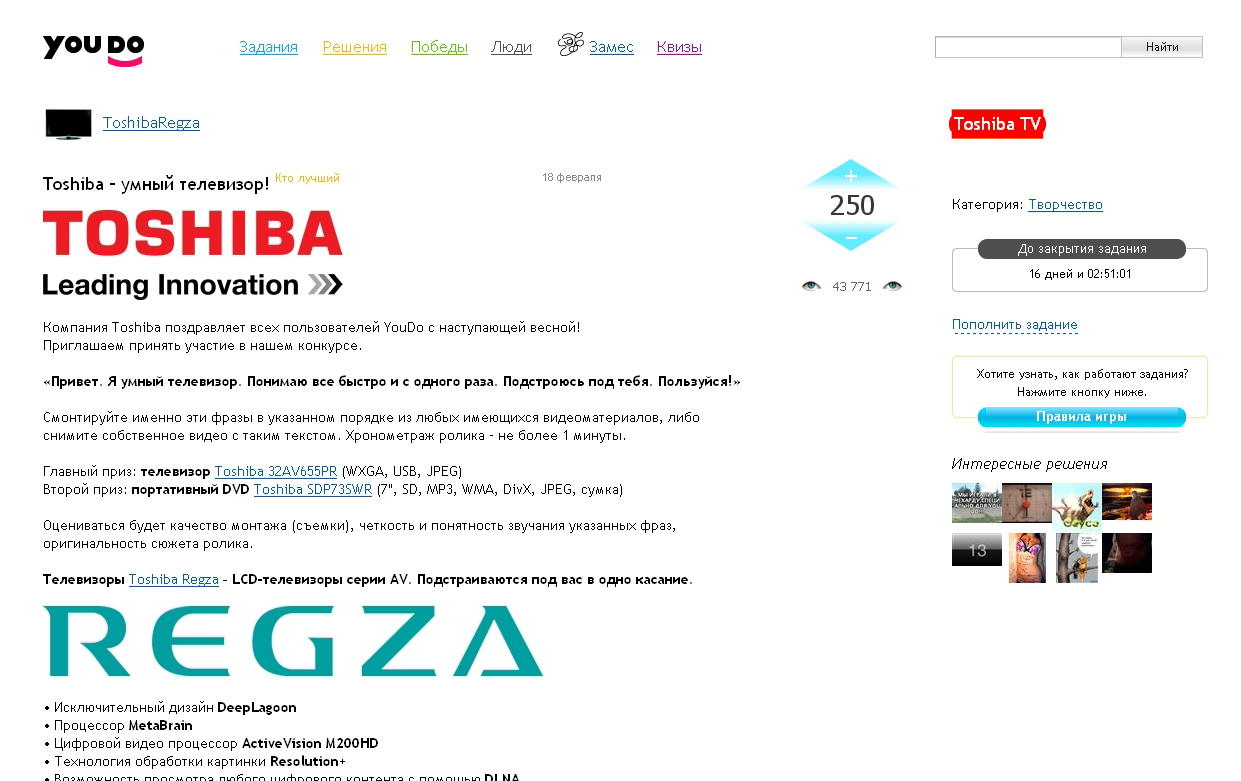 Про Toshiba Regza снимают любительские роликиМедийное агентство LBL Media запустило в сети Интернет творческий конкурс, участником которого может стать любой желающийВзаимодействие с потребителем и вовлечение его в диалог является одним из самых эффективных средств продвижения бренда. Интернет даёт неограниченные возможности для такого взаимодействия. LBL и Toshiba Regza решили вовлечь целевую аудиторию в интерактивный творческий конкурс, который даёт возможность остаться в сердце потенциального потребителя надолго. Площадкой для конкурса стал сайт Youdo.Ru, ежедневная аудитория которого на данный момент составляет порядка 50 000 посетителей. Youdo.Ru - специализированный сайт, на котором ежедневно проводятся творческие конкурсы. Победители получают денежные и ценные призы. Желающий стать обладателем премиального телевизора Toshiba Regza должен снять или смонтировать из любых видеоматериалов ролик хронометражем не больше 1 минуты со следующим текстом: "Привет. Я умный телевизор. Понимаю все быстро и с одного раза. Подстроюсь под тебя. Пользуйся!". Оцениваться будет качество монтажа (съемки), четкость и понятность звучания указанных фраз, оригинальность сюжета ролика. Конкурс является частью полномасштабной мультимедийной рекламной кампании, которую реализовывает КГ LBL для продвижения на российском рынке телевизоров Toshiba Regza. Интернет - самый приоритетный канал для продвижения бренда в связи с высокой важностью этого источника информации при выборе телевизора. Сайт Youdo.ru - сравнительно новый ресурс в сети Интернет, предоставляющий возможность создания вовлеченности "потребитель-бренд". Состав рабочей группы: Ольга Беляева - руководитель группы по работе с клиентами Елена Андреева - менеджер по работе с клиентами Ирина Коновалова - директор по исследованиям и стратегическому планированию Ирина Гурулёва - руководитель медиа-группы Илья Белов - менеджер по медиапланированию