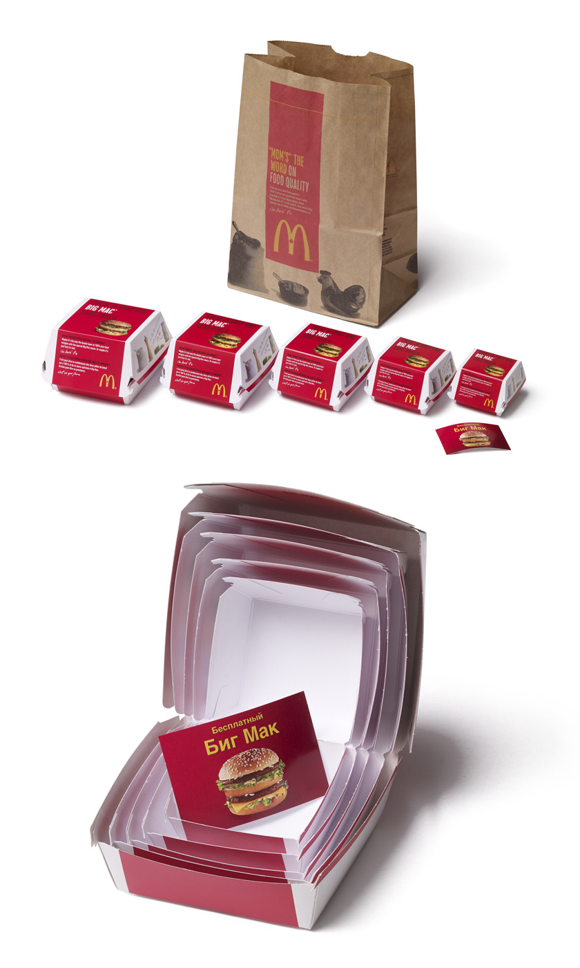 Биг Мак - матрешкаВо время Олимпиады в Канаде появилась необычная упаковка фирменного гамбургера McDonald'sВо время Олимпийских Игр в Ванкувере, здание, штаб-квартира России располагалась прямо напротив флагманского ресторана McDonald's. Чтобы поприветствовать российских спортсменов, компания отправила им купоны на полчение бесплатных Биг Маков, запакованные в стиле традиционных русских матрешек, причем надписи на купонах были сделаны по-русски. Состав творческой группы Advertising Agency: Cossette, Vancouver, Canada Creative Director: Bryan Collins Creative Director: Rob Sweetman Art Director: Scott Schneider Copywriter: Jeff Shorkey Designer: Rob Horsman |