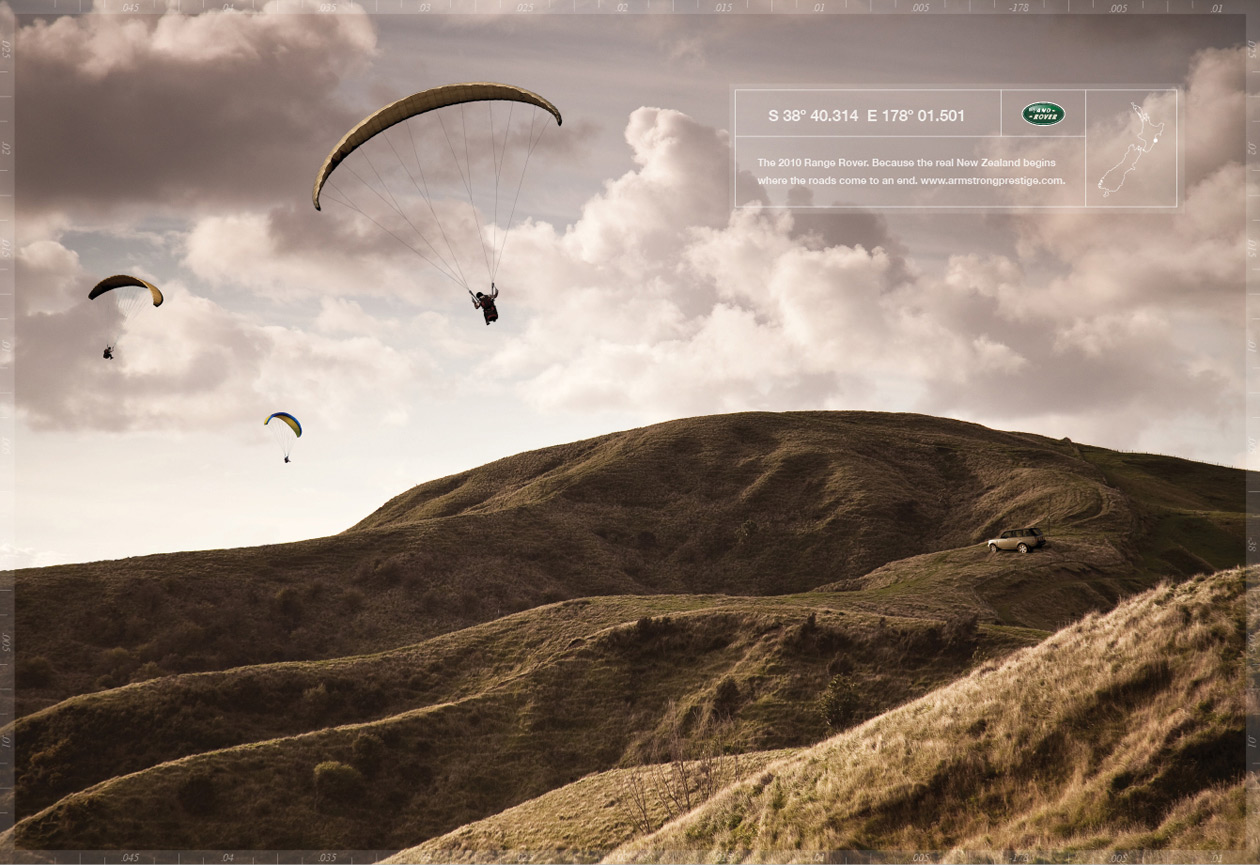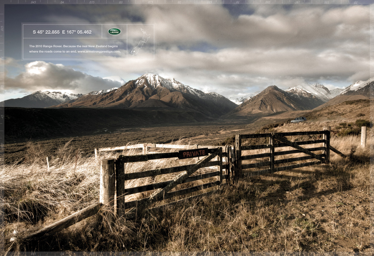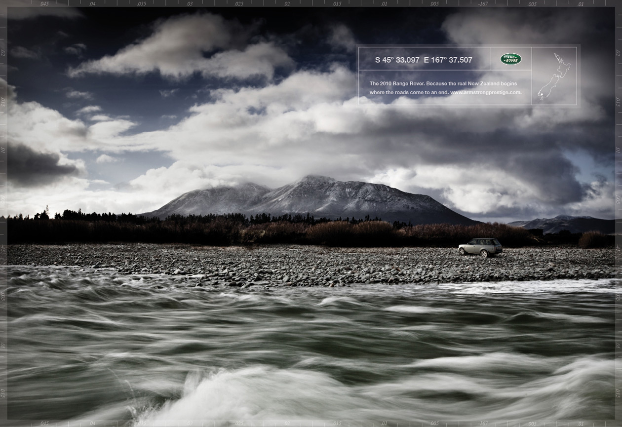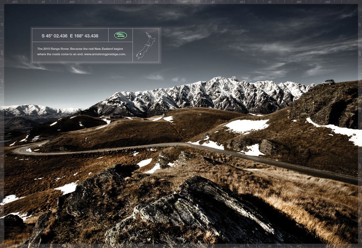 Land Rover с точным месторасположениемРеклама автодилера Armstrong PrestigeАгентство R+W Advertising из Лас-Вегаса разработало печатную кампанию для автодилерской компании из Новой Зеландии Armstrong Prestige. Создатели рекламы выбрали очень интересный способ привлечения внимания к офисам компании - принты изображают вовсе не авто, а виды Новой Зеландии. В дополнение на плакатах даны координаты Range Rover'ов, находящихся в том или ином салоне Armstrong Prestige, где любой желающий может приобрести автомобиль лучше всего подходящий для исследования бездорожных красот этой страны. Слоган кампании "Range Rover 2010. Потому, что настоящая Новая Зеландия начинается там, где дороги заканчиваются". Состав творческой группы Advertising Agency: R+W Advertising, Las Vegas, USA Creative Director: Scott Robertson Art Director: Scott Robertson Copywriter: Scott Robertson Photographer: Scott Robertson Retoucher/Designer: Dan Leszczynski |