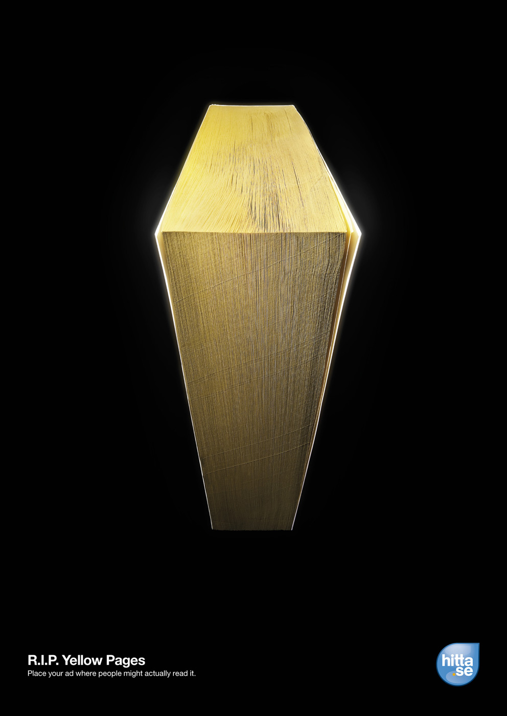 Шведы хоронят Yellow PagesАмбициозная кампания поисковика HittaСтокгольмское агентство Masscreation выпустило рекламу лидирующего шведского поисковика под названием Hitta, что в переводе означает "Найти". Цель кампании привлечь рекламодателей для размещения баннеров на страницах поиска. Принт изображает необычного вида гроб, в котором, судя по подписи, рекламисты решили похоронить информационный справочник Yellow Pages, существующий как в печатном, так и в электронном виде. В слогане креаторы делают упор на том, что реклама на "Желтых страницах" - не приносит пользы: "Покойтесь в мире Yellow Pages. Размещайте вашу рекламу там, где ее наверняка прочтут". Состав творческой группы Advertising Agency: Masscreation, Stockholm, Sweden Creative Director / Art Director / Copywriter: Masscreation Photographer: Petter Karlberg |